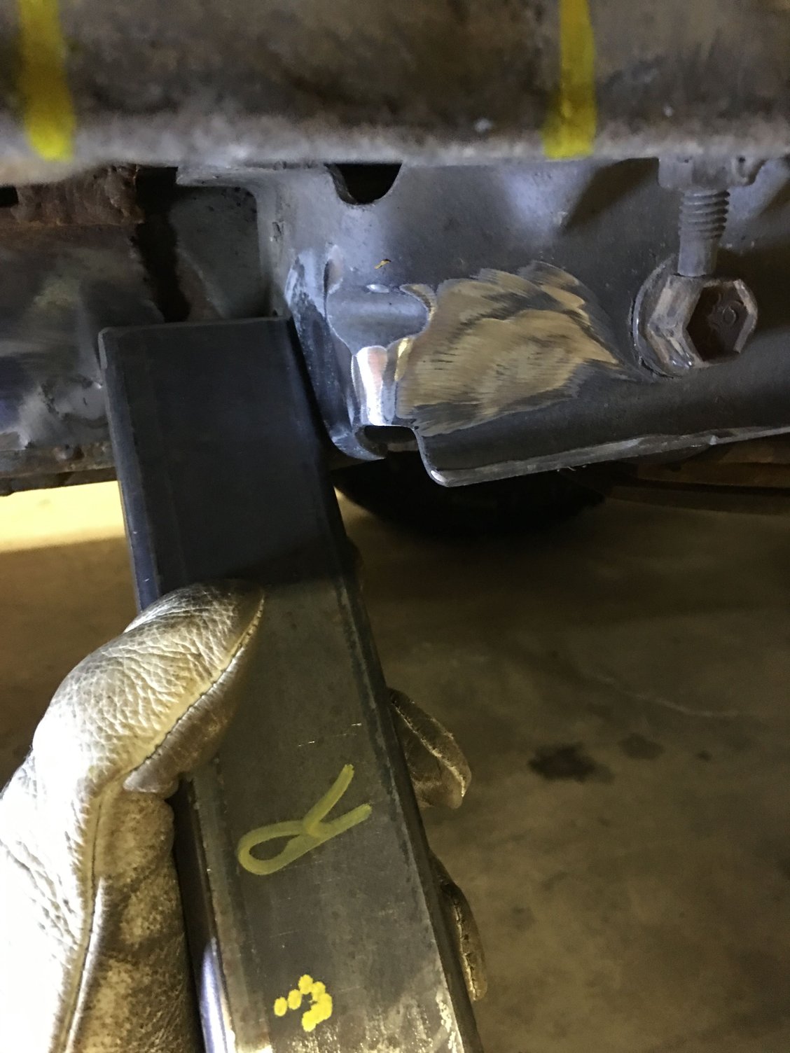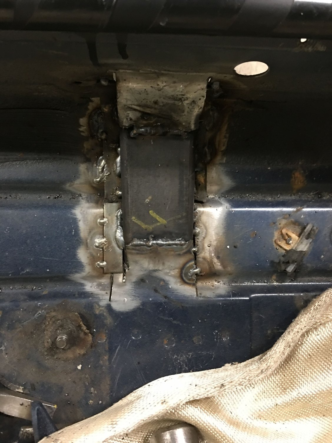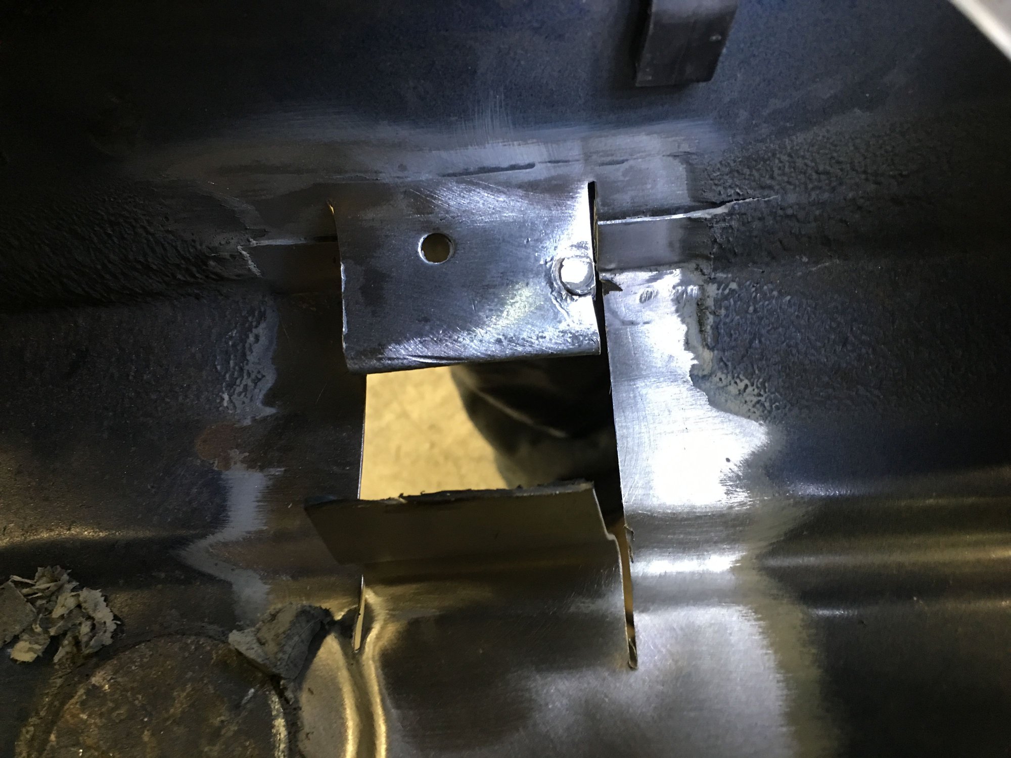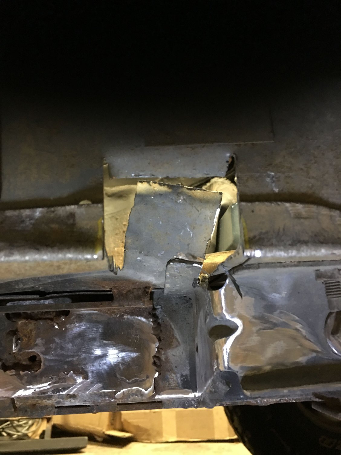 Start at the rear mount. Hold the tie in against the spring mount bracket, then mark the floor. Clean off the spring bracket so ya dont forget to do it later. Ill be welding the tiein to this bracket to strengthen it to 👍 First cut. Dont go crazy on length of cut, yet. This is what it looks like inside. Look at all that seam sealer 😮 Its easier to clean off now before ya start bending stuff up. Now cut across the first two cuts. Start bending up the floor... Try the tie in, cut and fold some more till it fits. Like this. Ran outta steam tonight! These flaps will get welded to the tie ins later.