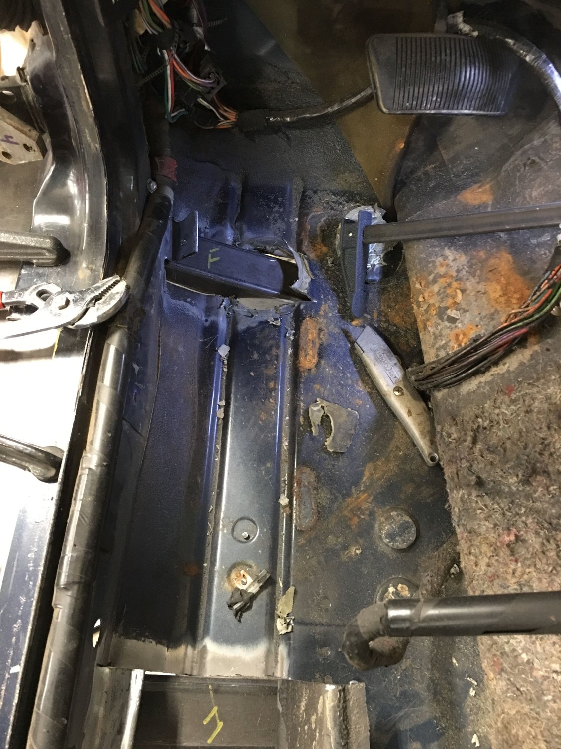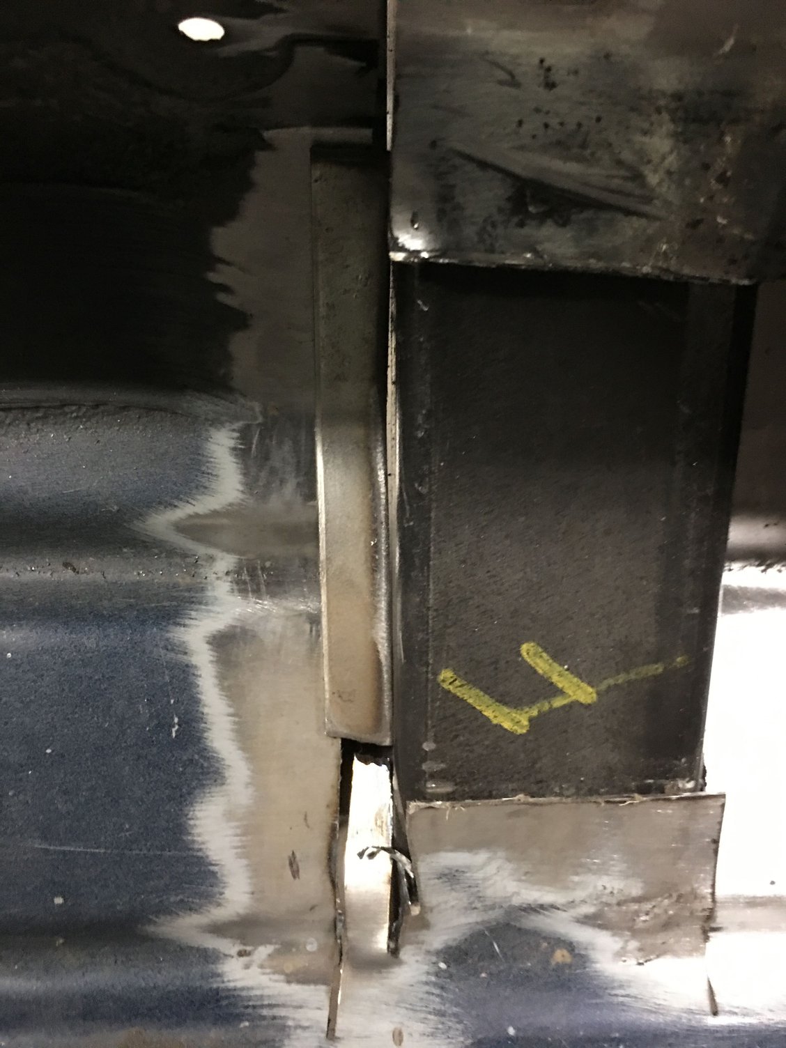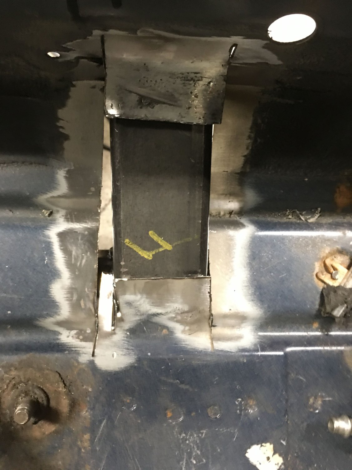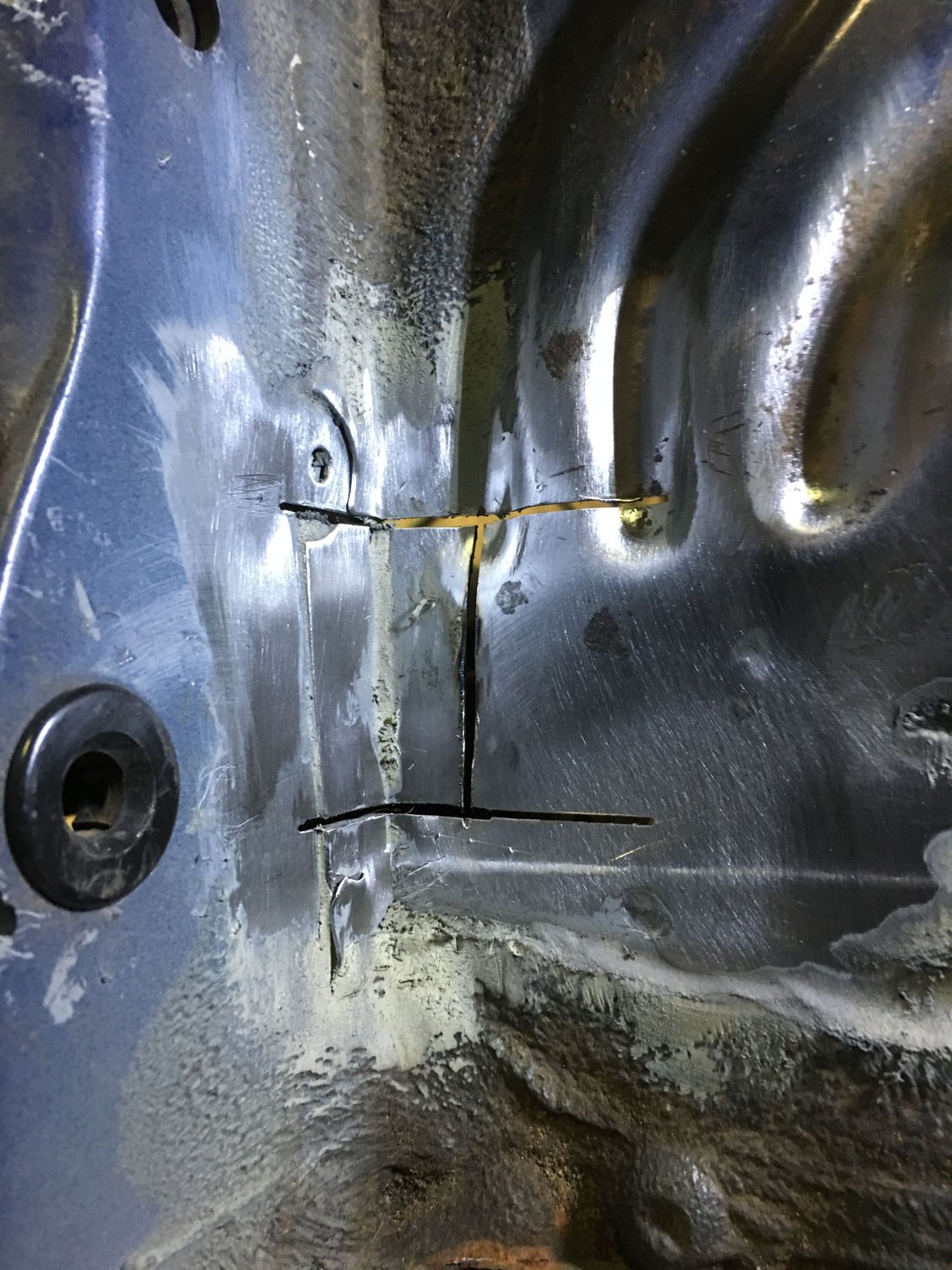 Start at the rear mount. Hold the tie in against the spring mount bracket, then mark the floor. Clean off the spring bracket so ya dont forget to do it later. Ill be welding the tiein to this bracket to strengthen it to 👍 First cut. Dont go crazy on length of cut, yet. This is what it looks like inside. Look at all that seam sealer 😮 Its easier to clean off now before ya start bending stuff up. Now cut across the first two cuts. Start bending up the floor... Try the tie in, cut and fold some more till it fits. Like this. Ran outta steam tonight! These flaps will get welded to the tie ins later.