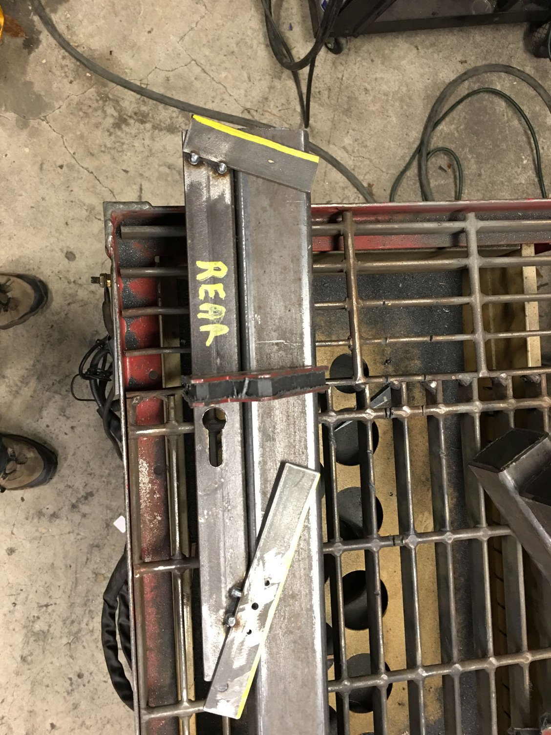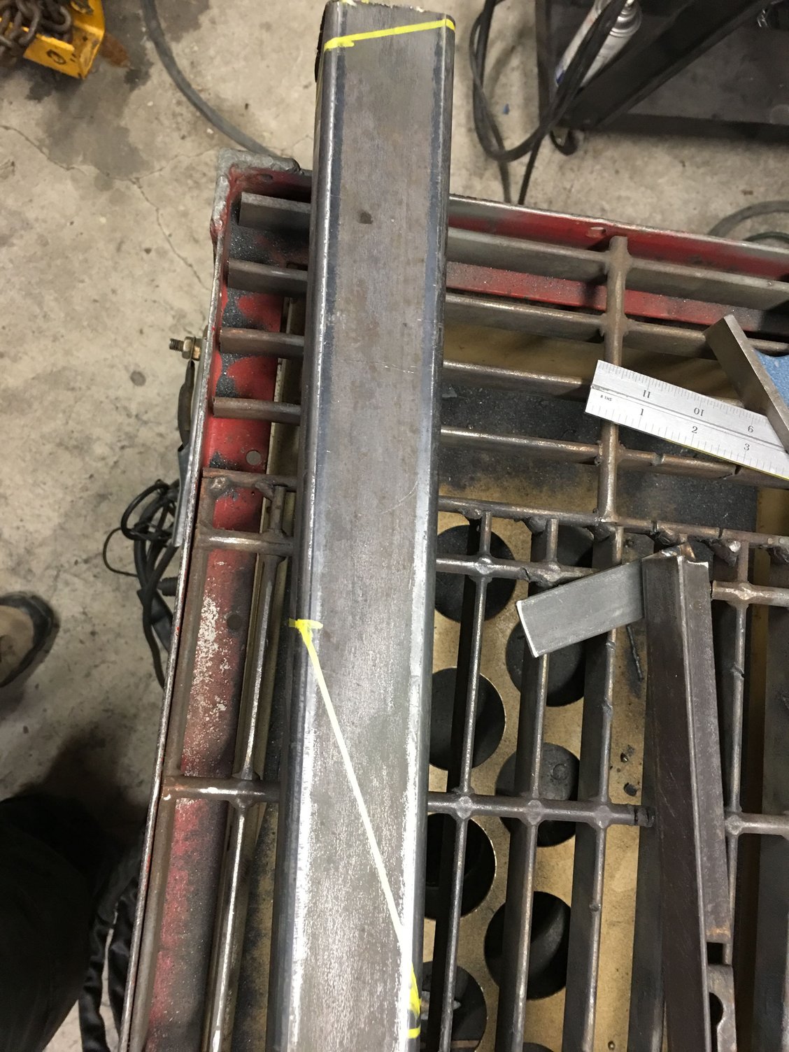 On the outboard side of the plate I beveled the edge so it would fit better. Grind the welds smooth where the plate lies. Then position the plate where you want it. My plate is 48 x 15, 3/16 thick. I left about a 1/4 overhang on the inboard side. There is a angled area on the frame that this will contact to make welding easier and provide better support. Made some index marks after I drilled and installed clecos to hold it in position when I install it on the Jeep. I also marked the other side of the plate to drill 1 holes thatll line up with the middle supports to plug weld them.
