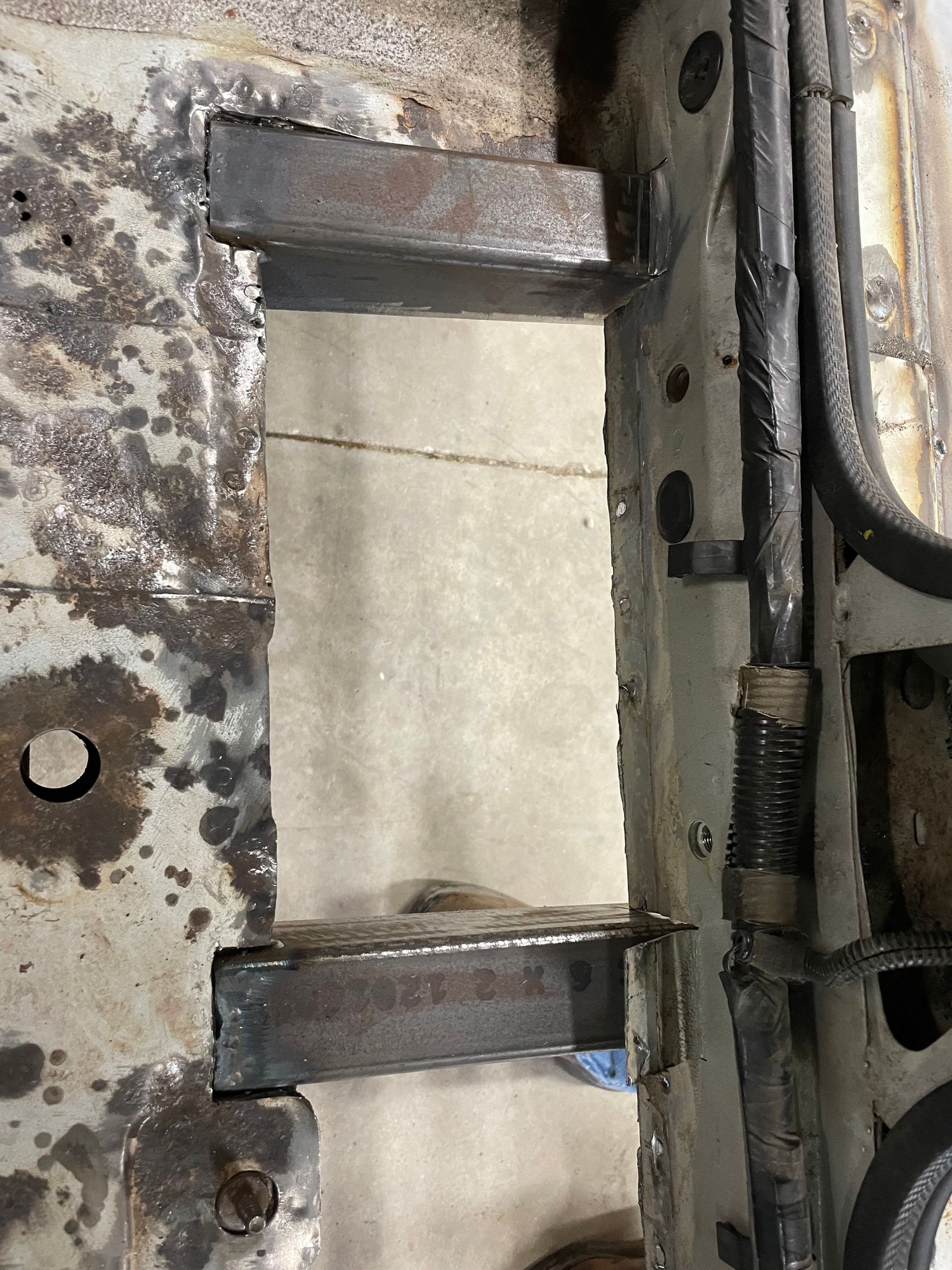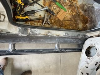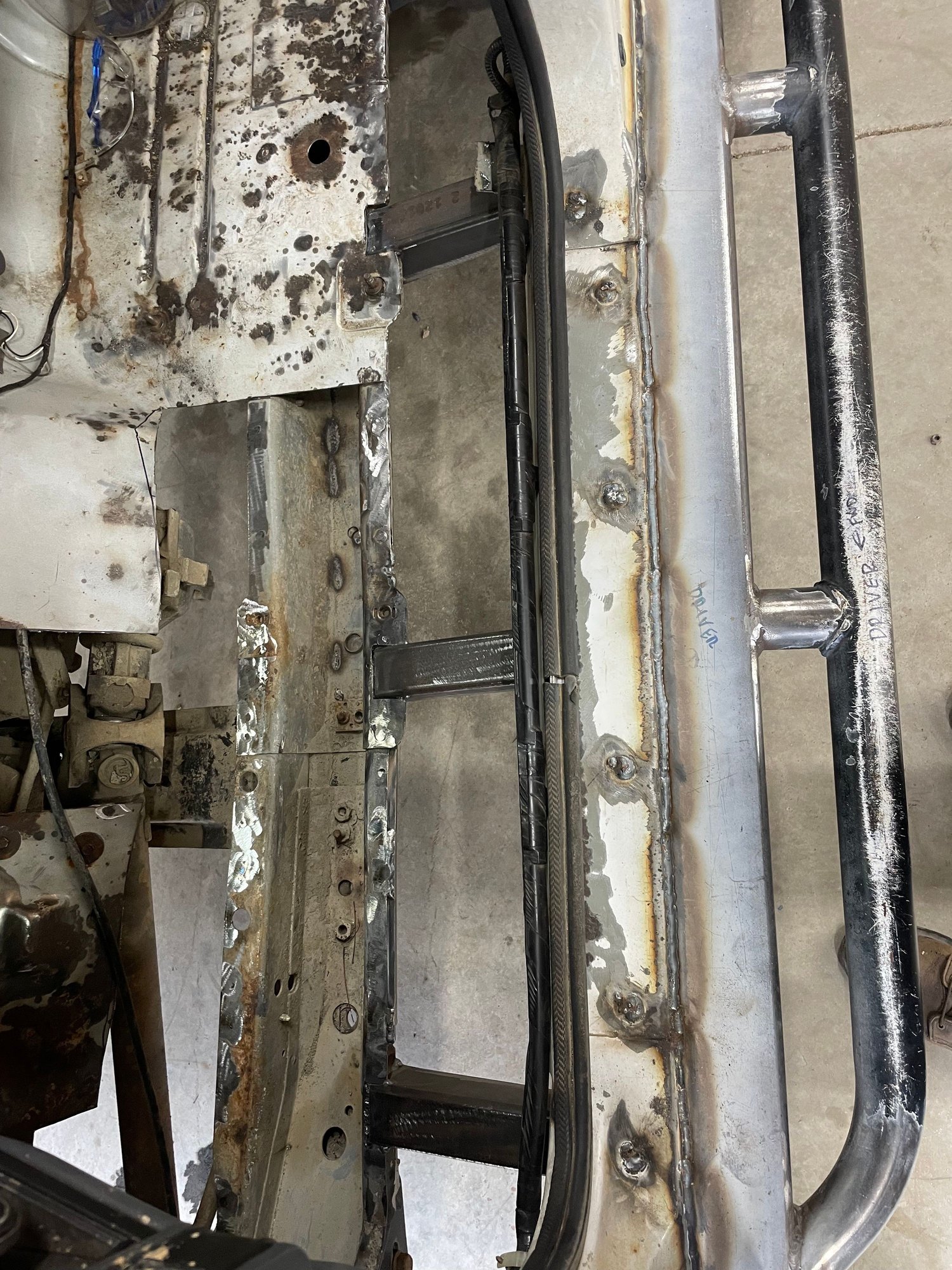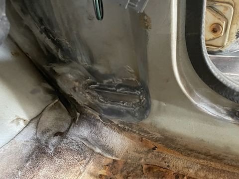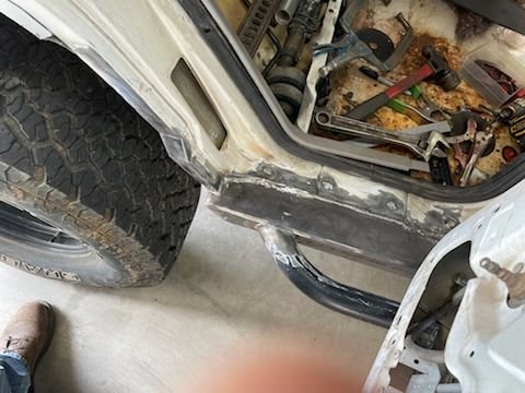 I'm done with the fab work as of this afternoon. Didn't bother to take pictures of the driver's side boat side, was just rinse and repeat of the passenger side. I did take a picture of the floor pan patch though, as that was a nuisance to fit up. I'm definitely not a sheet metal guy. I did weld out the patch panel 100% after this pic was taken. Next step is to sand blast everything, prime, seam seal, second coat of primer, and Monstaliner the floor pans. I'll paint the bottom side, rub rails, and jams black to make touch ups easy.
