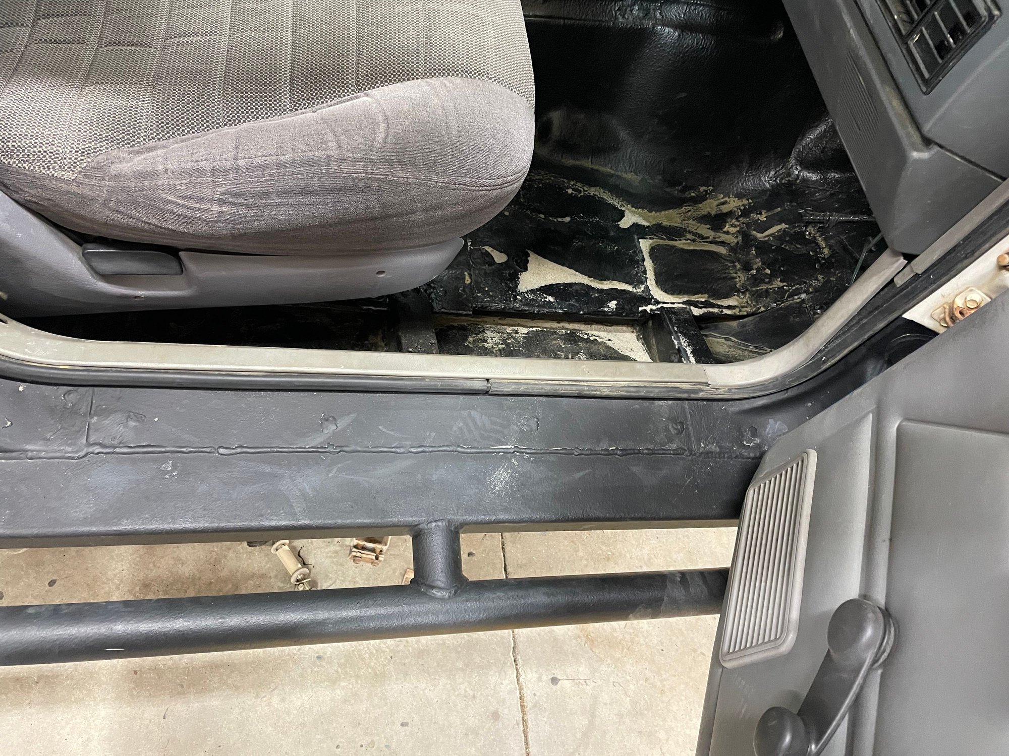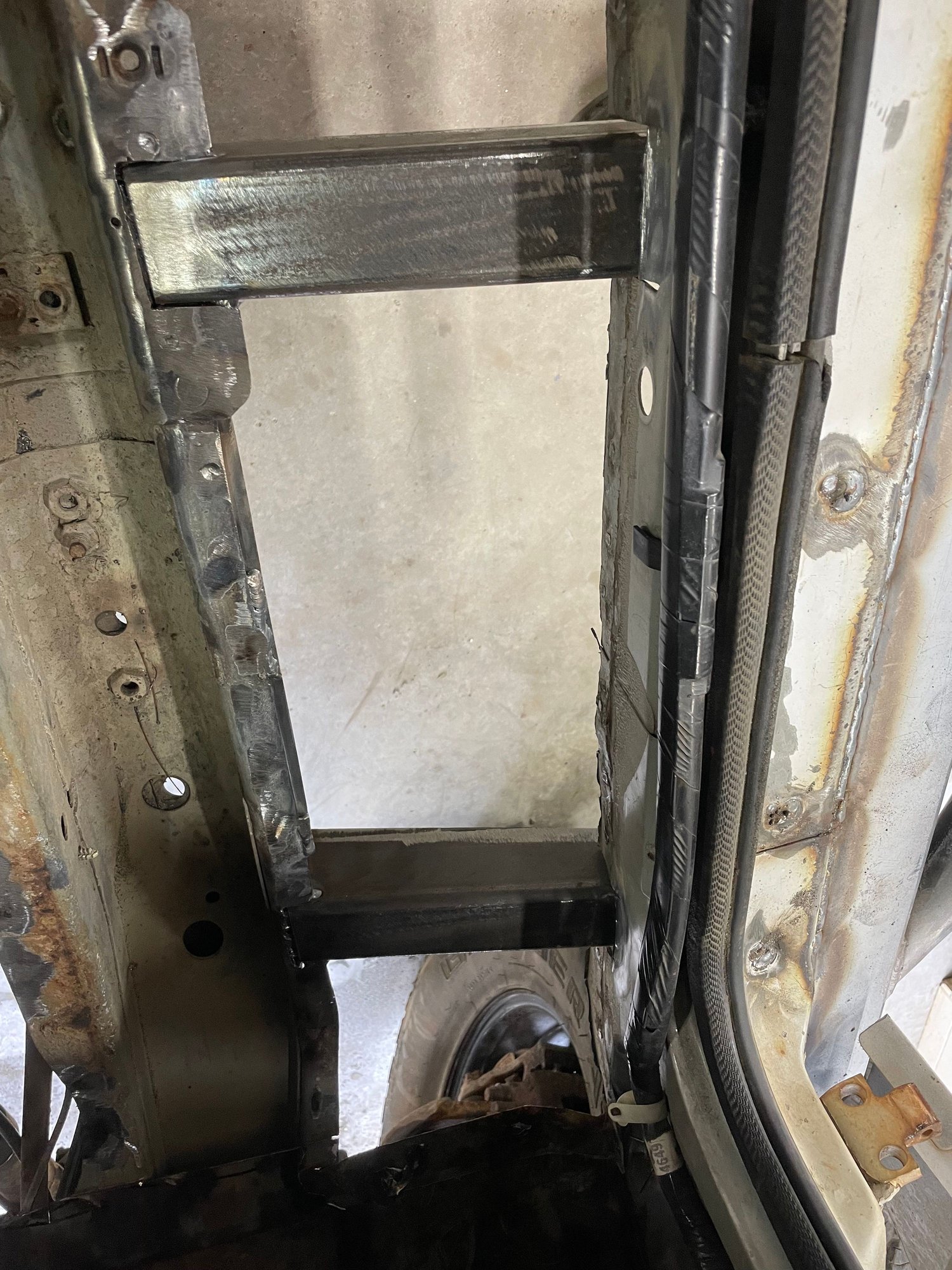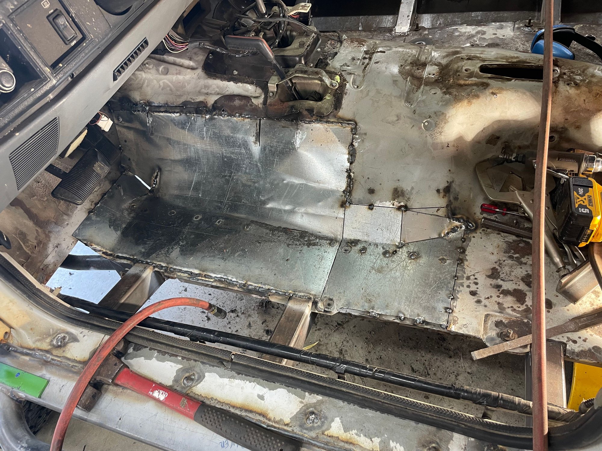 I'm done with the fab work as of this afternoon. Didn't bother to take pictures of the driver's side boat side, was just rinse and repeat of the passenger side. I did take a picture of the floor pan patch though, as that was a nuisance to fit up. I'm definitely not a sheet metal guy. I did weld out the patch panel 100% after this pic was taken. Next step is to sand blast everything, prime, seam seal, second coat of primer, and Monstaliner the floor pans. I'll paint the bottom side, rub rails, and jams black to make touch ups easy.