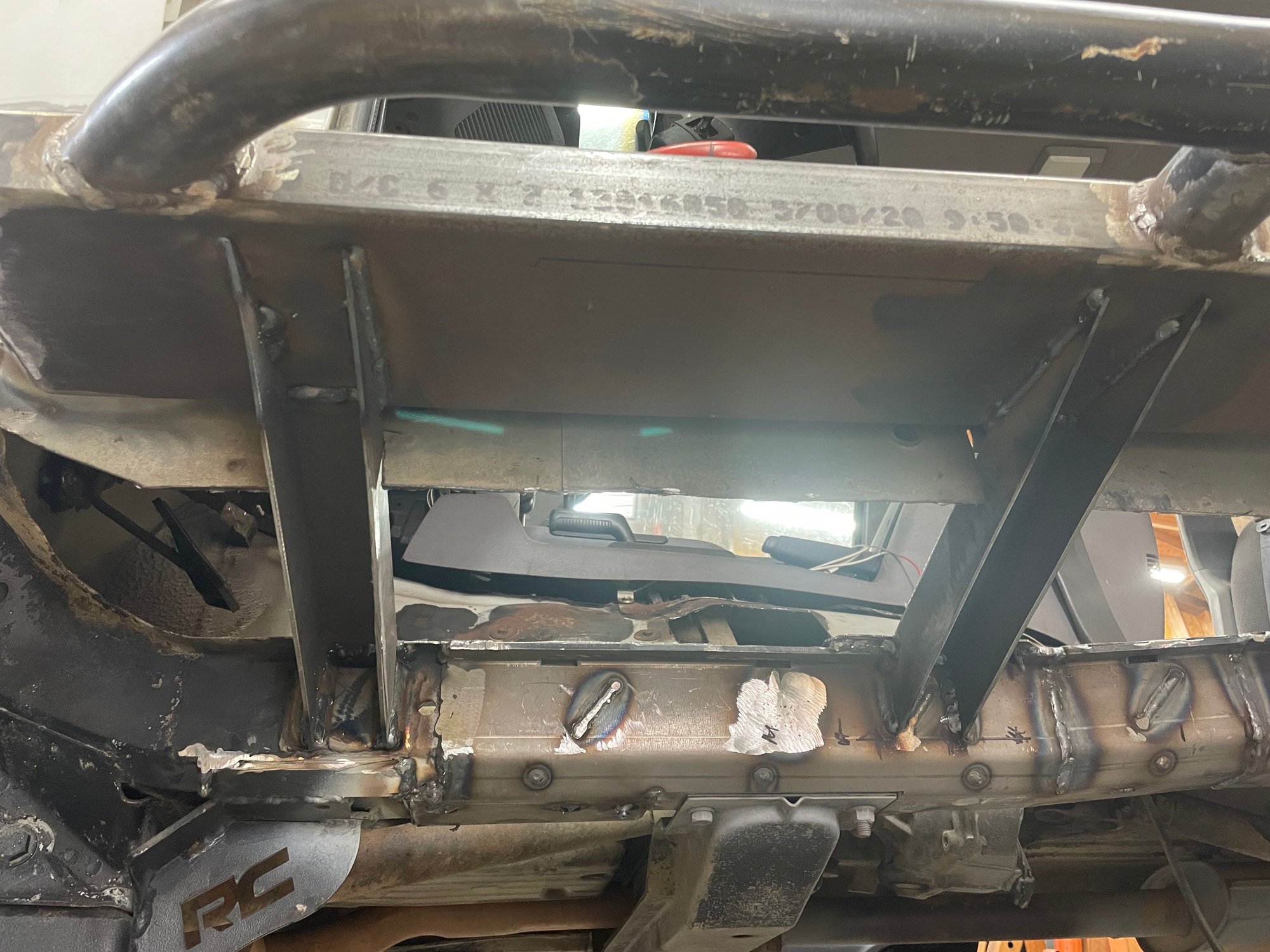 I am out of town again for work. Got in a hurry finishing the jeep up before I left town again and forgot to take pictures. I ran 3/16 plate between the frame rails and the rockers, along the bottom of the stiffeners. I welded the plate 100% to the rails, rockers, and stiffeners. I then sand blasted, epoxy primed, and monstaliner'd the pans and underside. I'll add some pictures of the final product in October, when I get home from this job.
