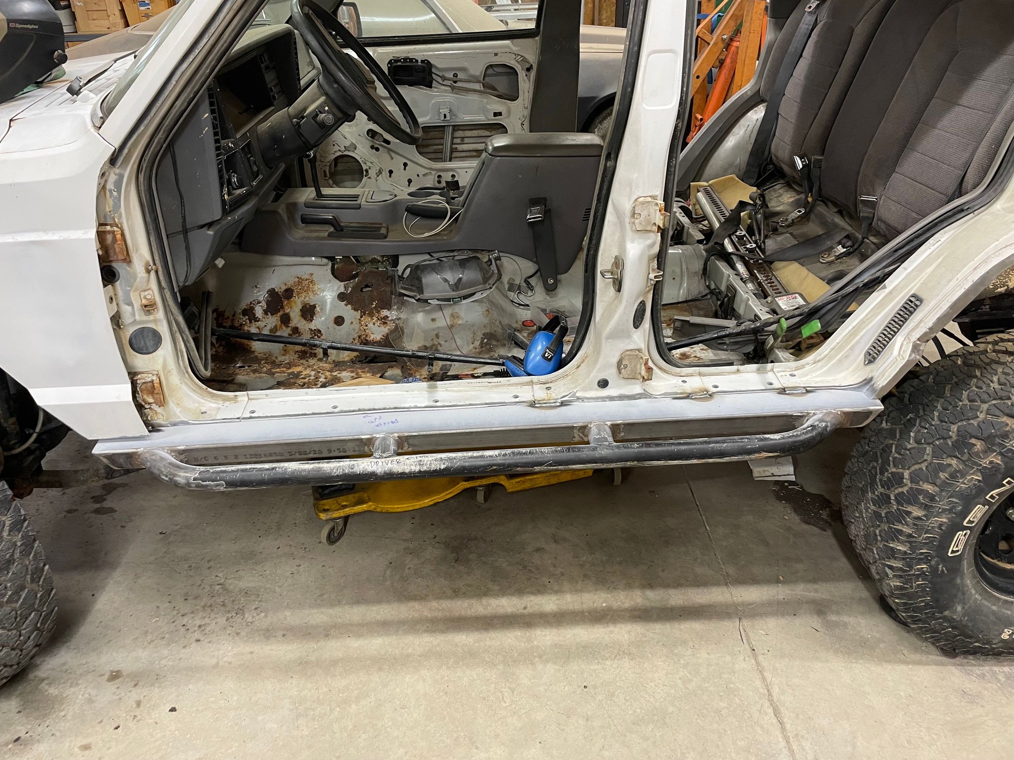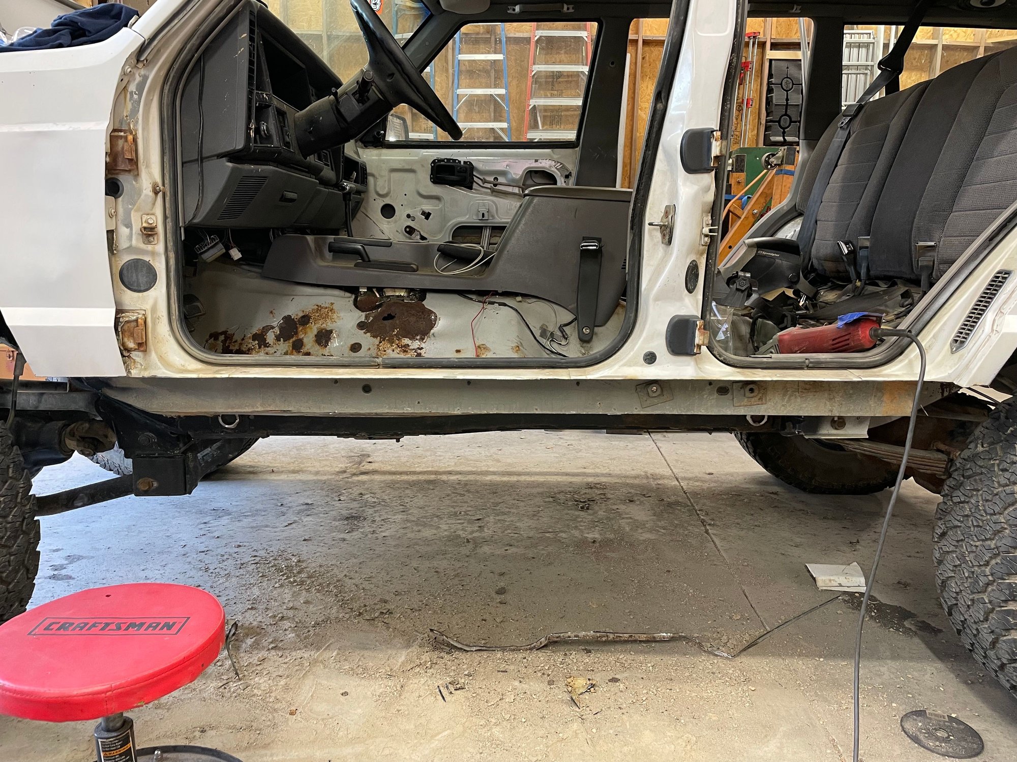 Got some more work done on the jeep yesterday. Things escalated quickly. Driver's side frame stiffener is welded in, went with Barnes. Driver's side rocker is welded in. Driver's side stiffeners are welded in. Driver's side floor pan is cut out where rotten.