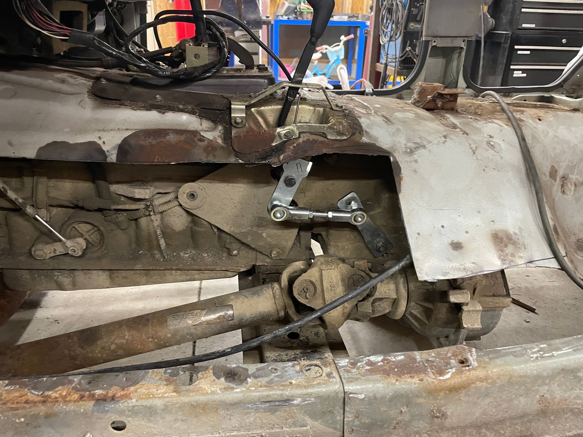 Made some more progress this morning at about 1AM, damn jet lag. Finished cutting out the rotten sheet metal in the driver's side floor pan, pulled the center console, parking brake lever and associated cables, and swapped out the TC shifter linkage. Couldn't think of a better time to change the TC shifter linkage, was wicked easy to swap out standing outside the jeep and reaching in through the top side. The picture doesn't show the rot around the chassis side linkage bracket, but the topside is severely corroded. It would have been a nuisance to weld a patch panel to that pitted metal.
