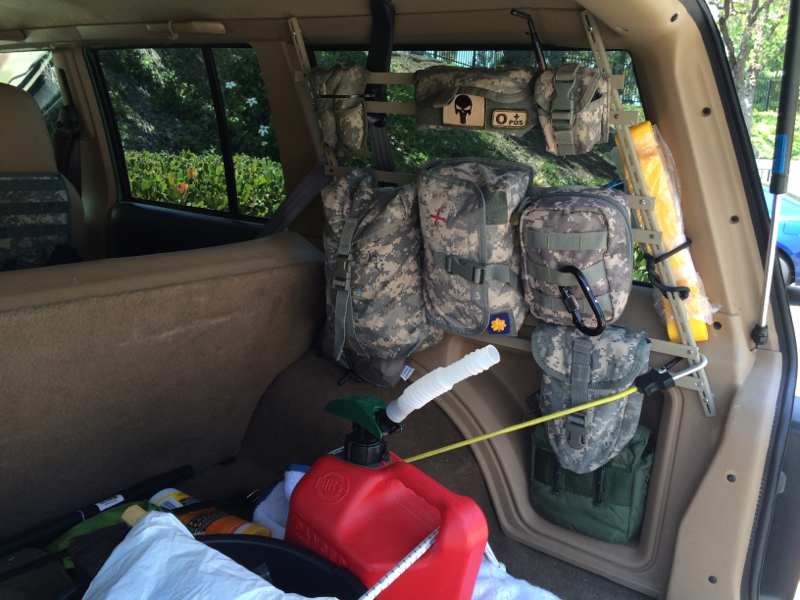 Just installed my window Molle system for Emergency supplies . Food, first aid, batteries, shovel, tow strap, emergency items and small hand held ham radio. It's mounted with 4 bolts. I used the rivnut tool to set threaded bolts into the side panel. I can easily remove it. I need to secure the water bottle inside the cubby hole a bit better. Waiting for more rivnuts to come in.