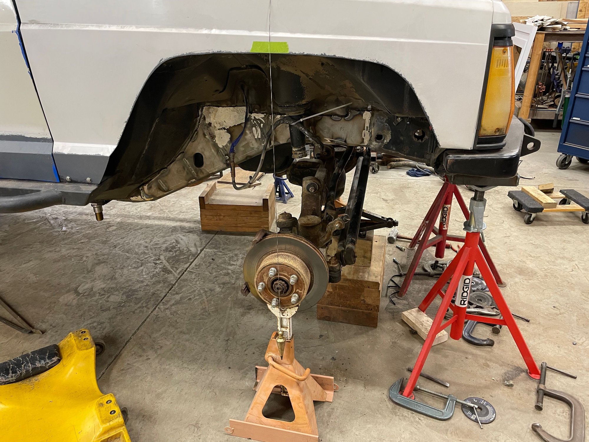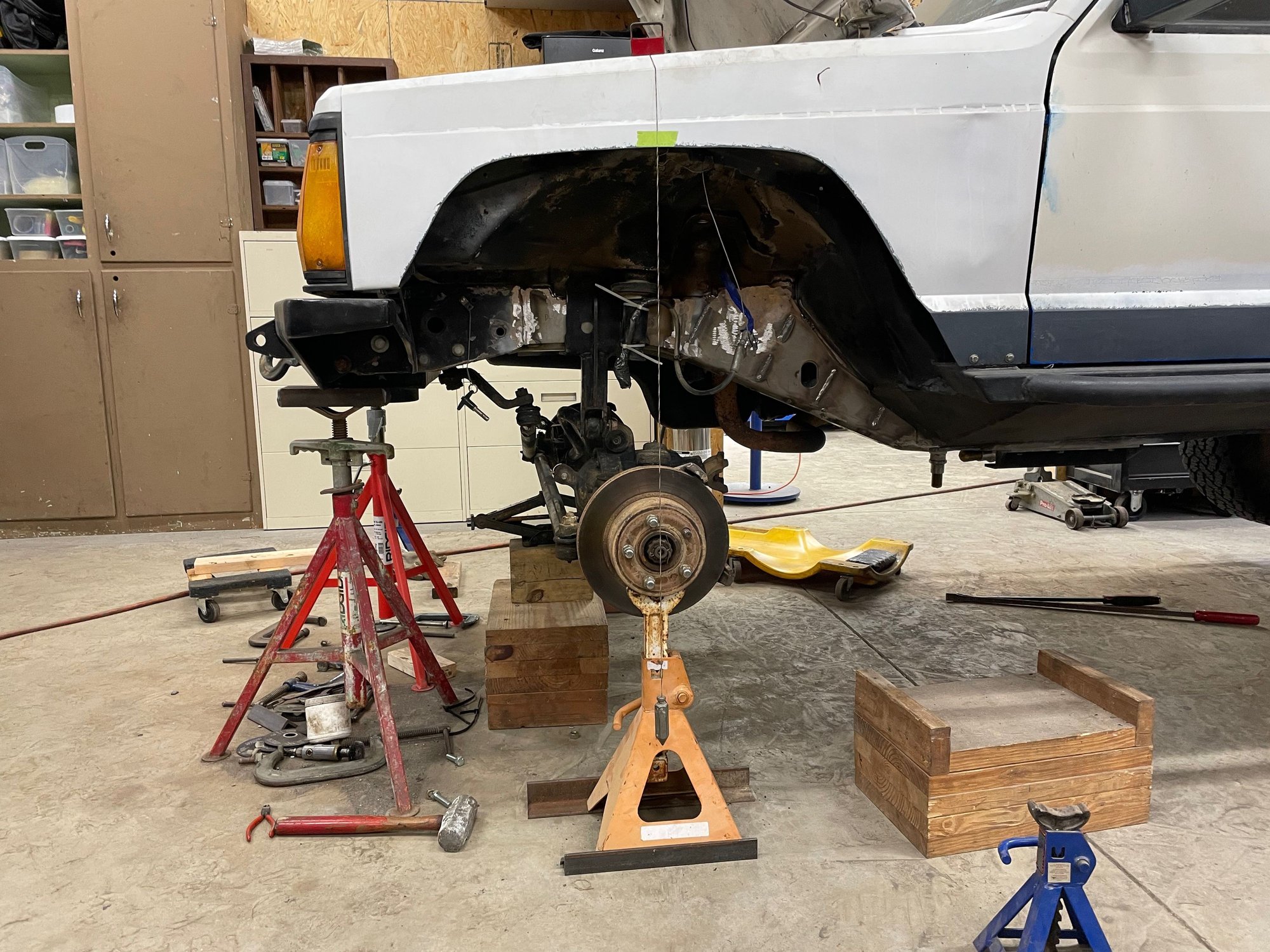 Today's progress was removal of the front suspension and hacked off the frame side control arm brackets.