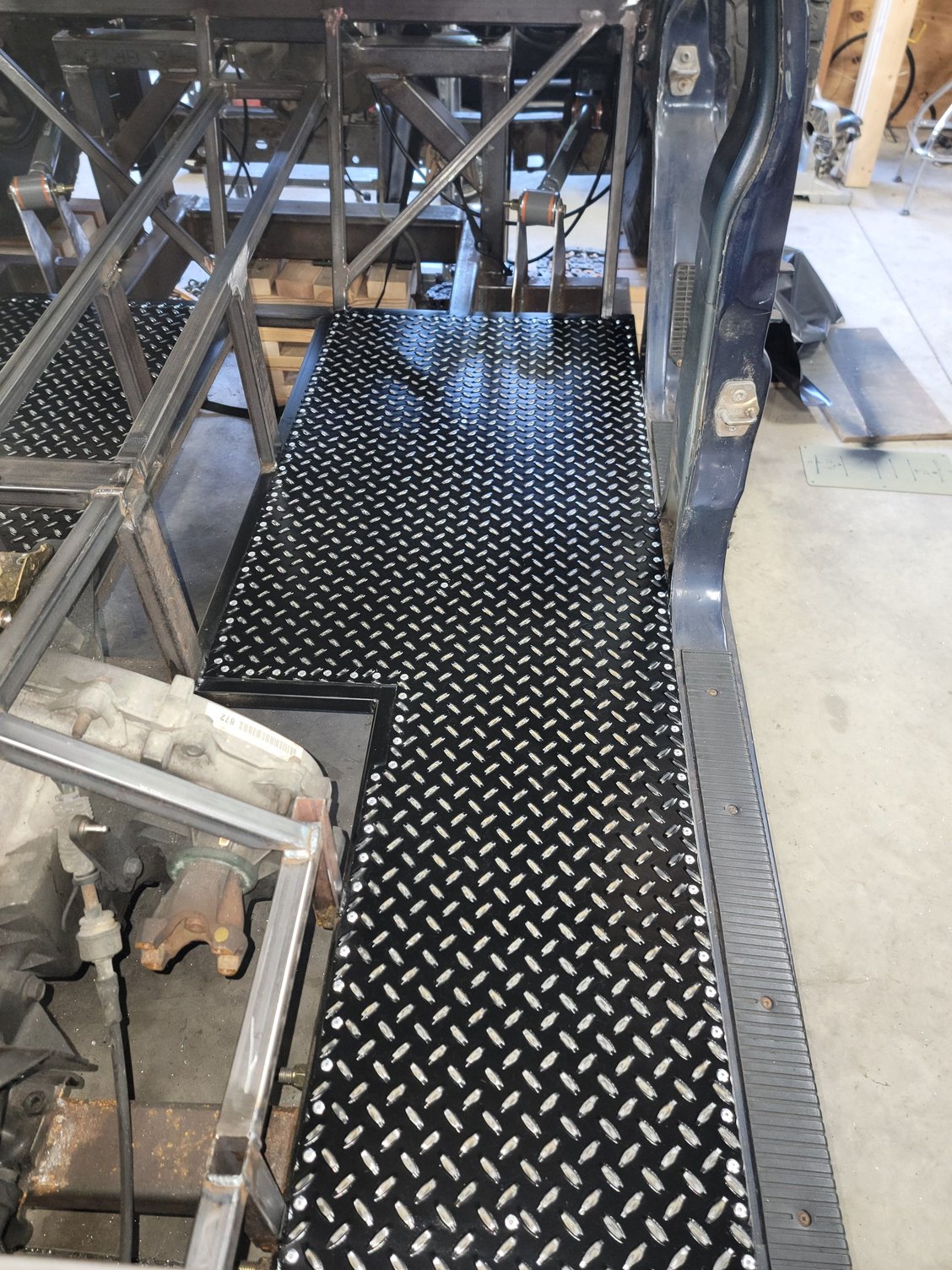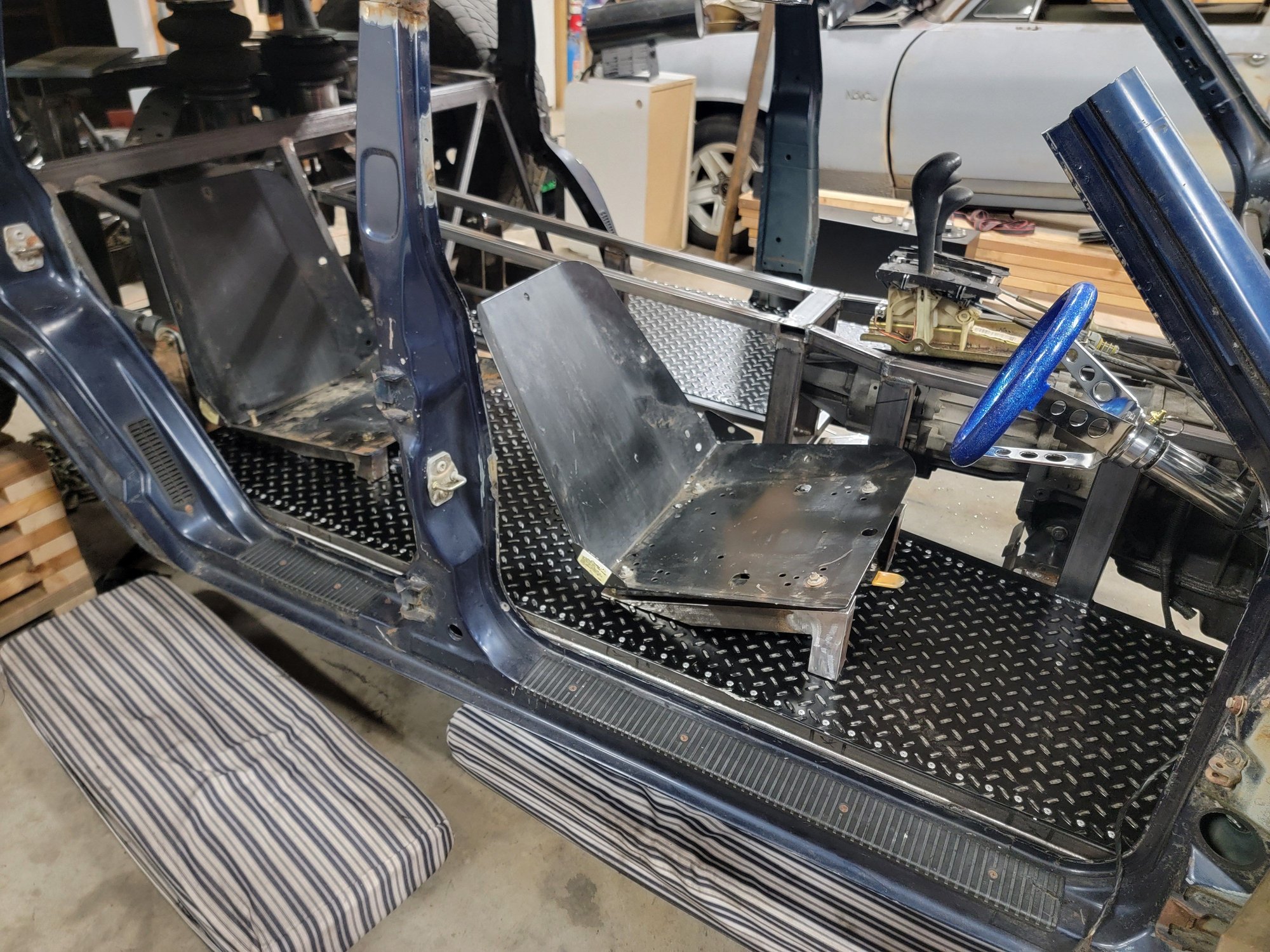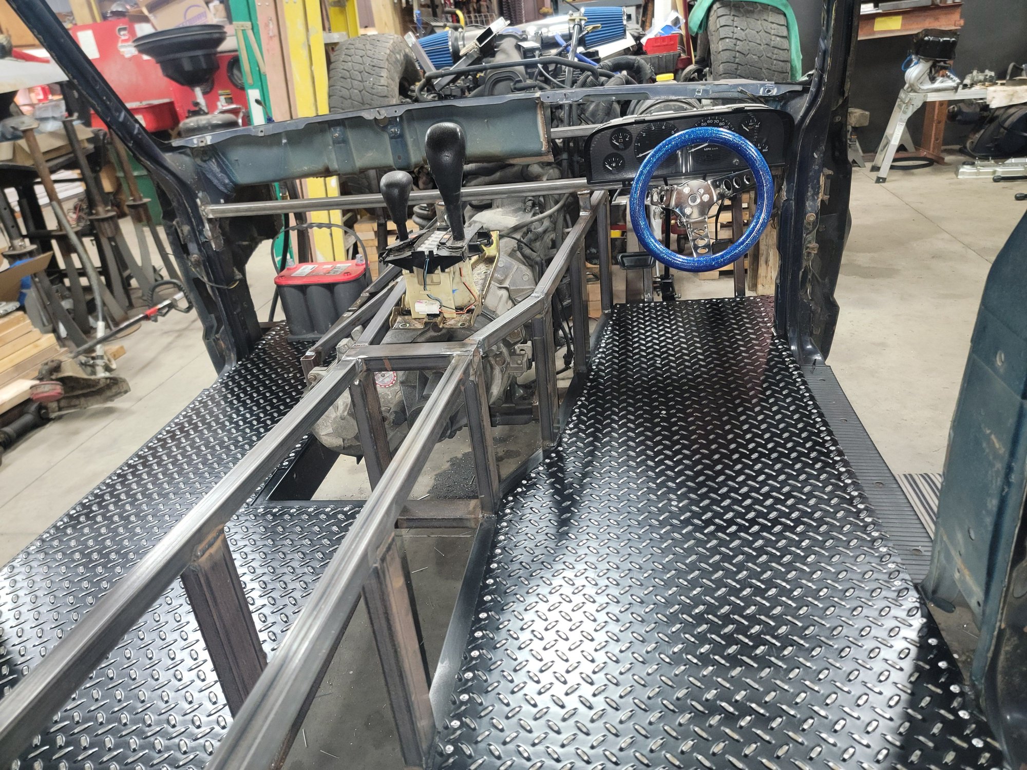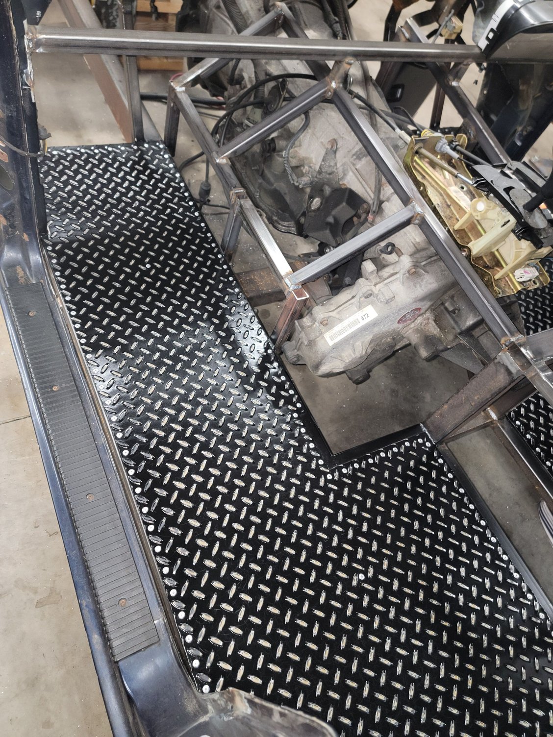 Sorry for no updates, been out for a surgery and wasn't able to do anything till this past week. Finally was up to working again and got the floors painted and installed. 293 rivets later and they are looking good! Got the new steering column loosely hanging where it is going to be mounted and the new steering wheel with quick release on it. Made seat brackets and started getting the seats installed and tonight the new battery mount came in so I went ahead and installed it as well.