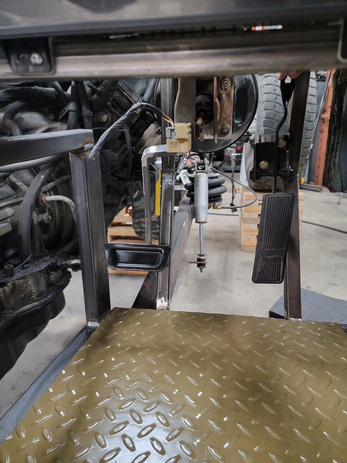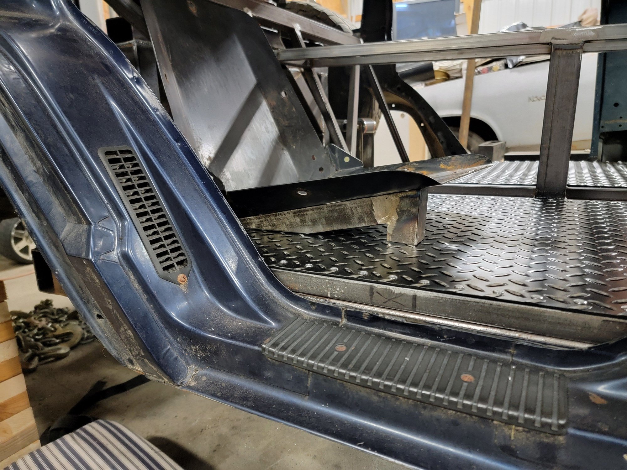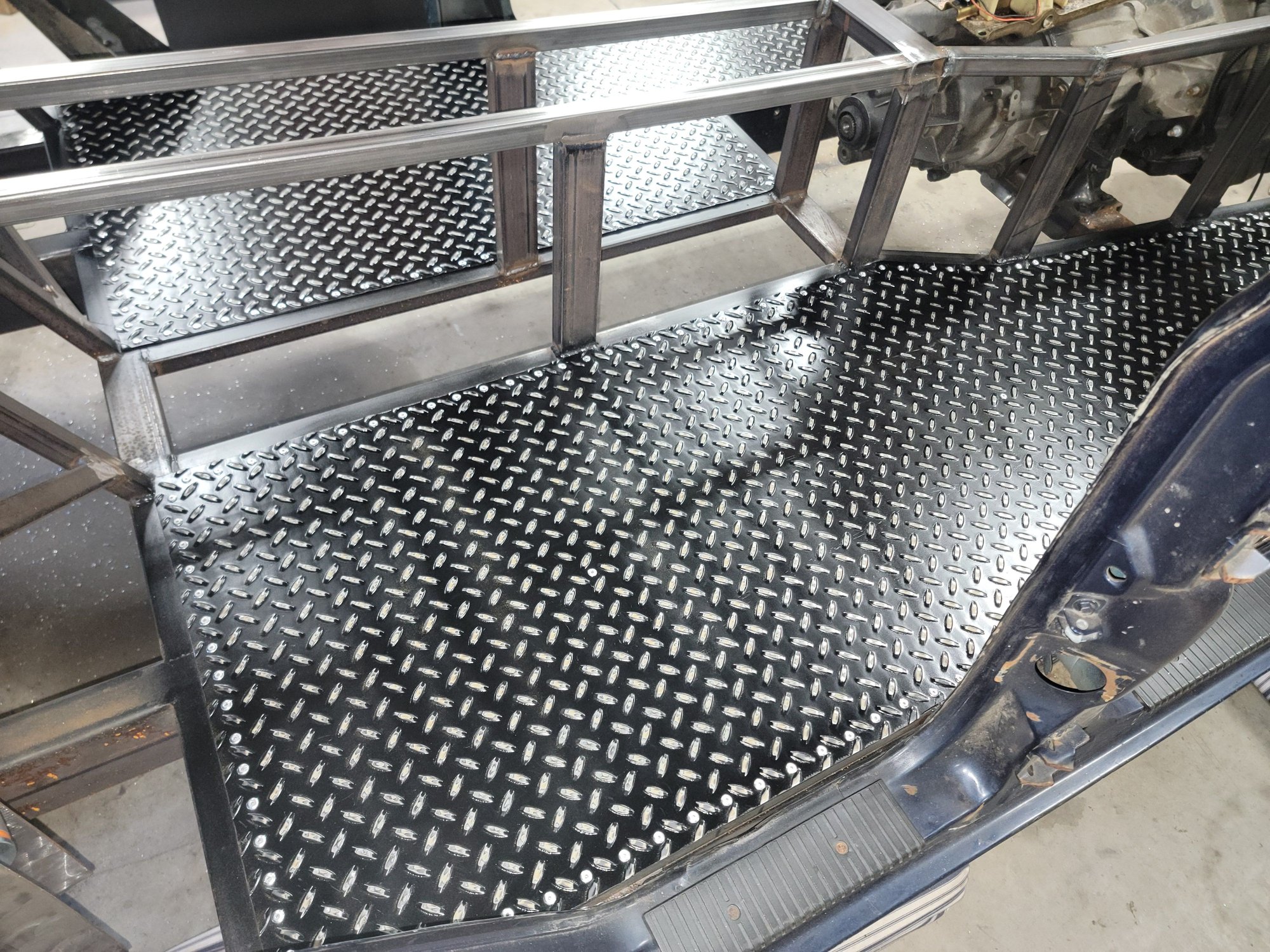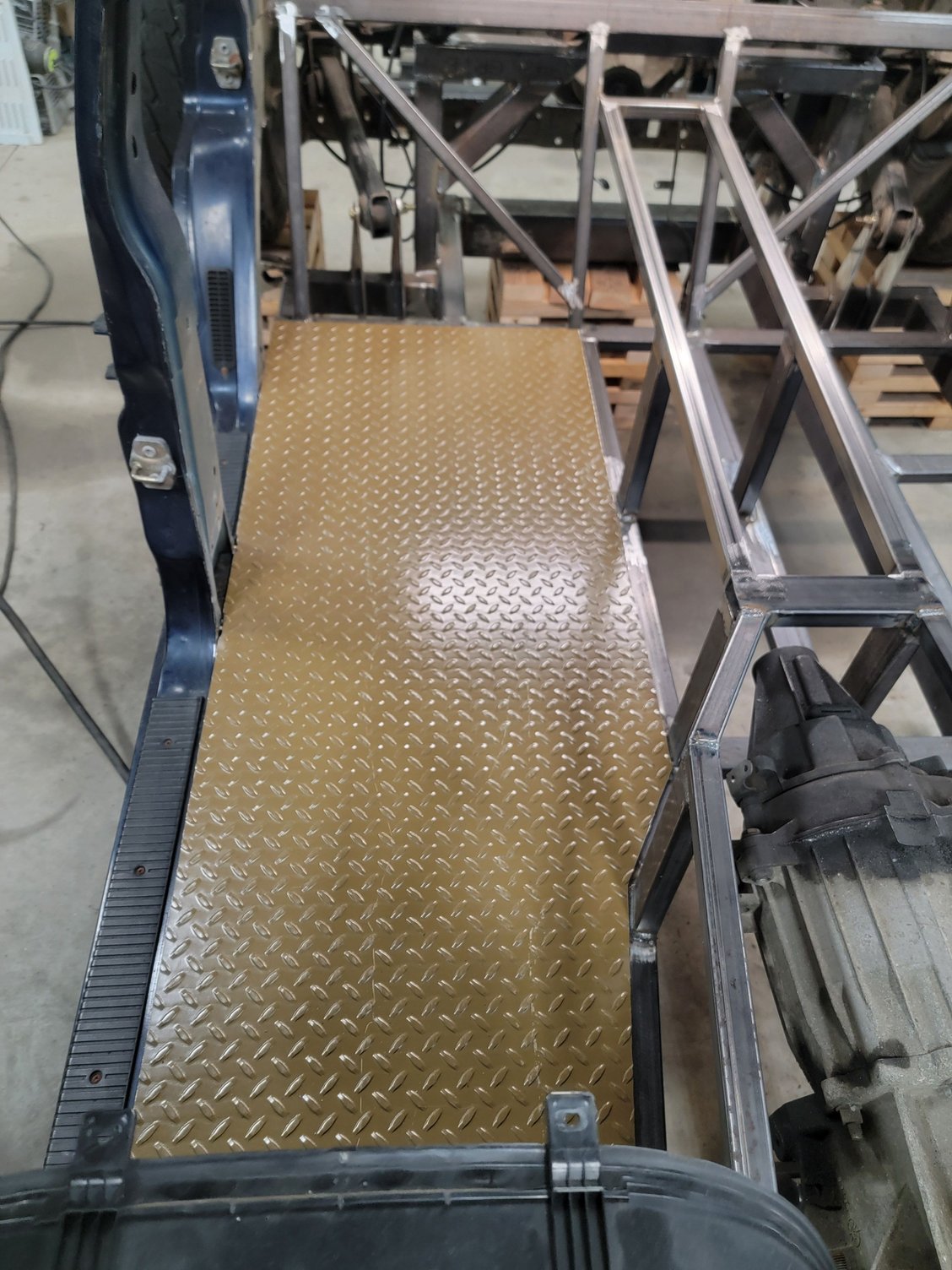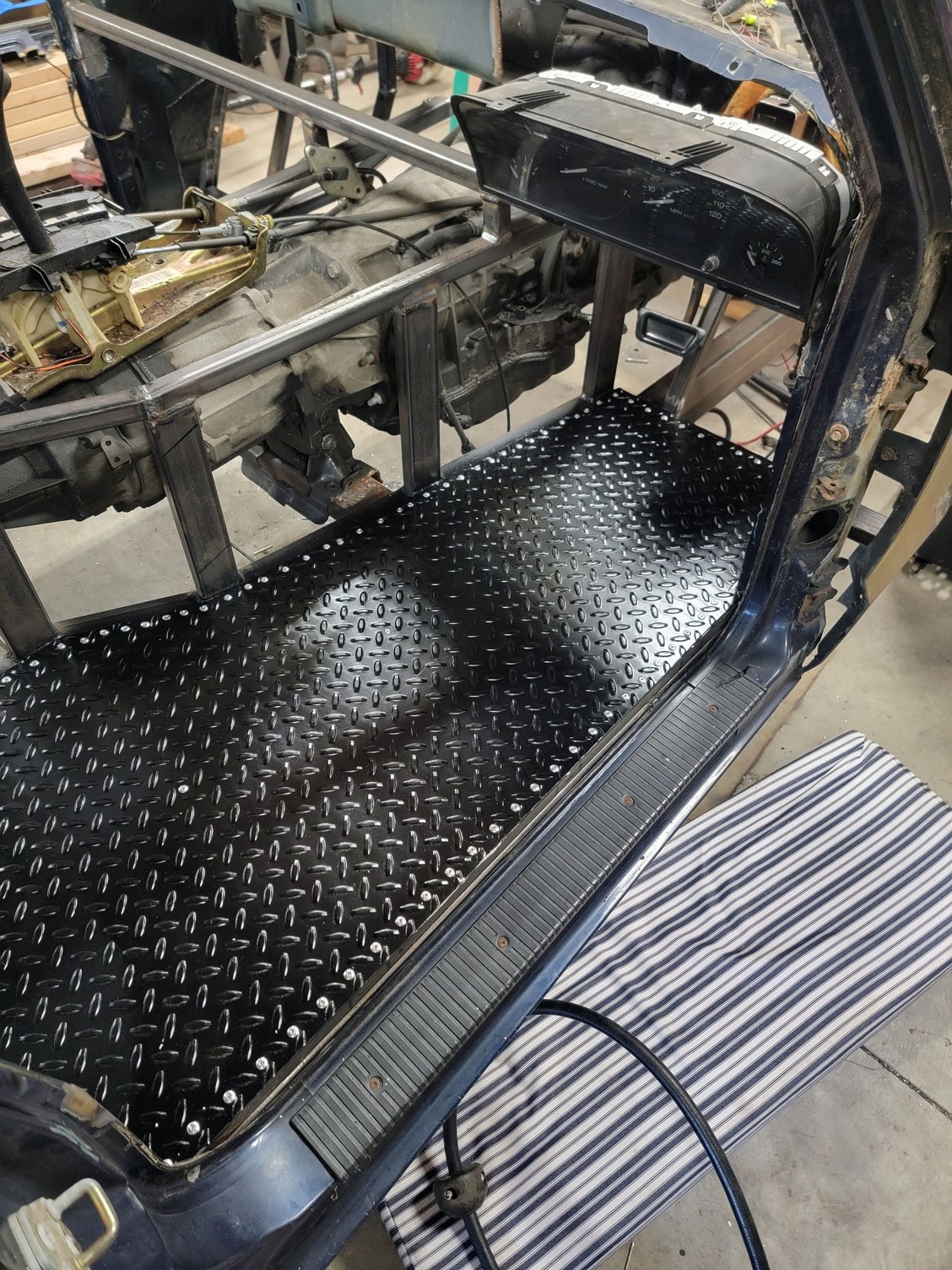 Sorry for no updates, been out for a surgery and wasn't able to do anything till this past week. Finally was up to working again and got the floors painted and installed. 293 rivets later and they are looking good! Got the new steering column loosely hanging where it is going to be mounted and the new steering wheel with quick release on it. Made seat brackets and started getting the seats installed and tonight the new battery mount came in so I went ahead and installed it as well.