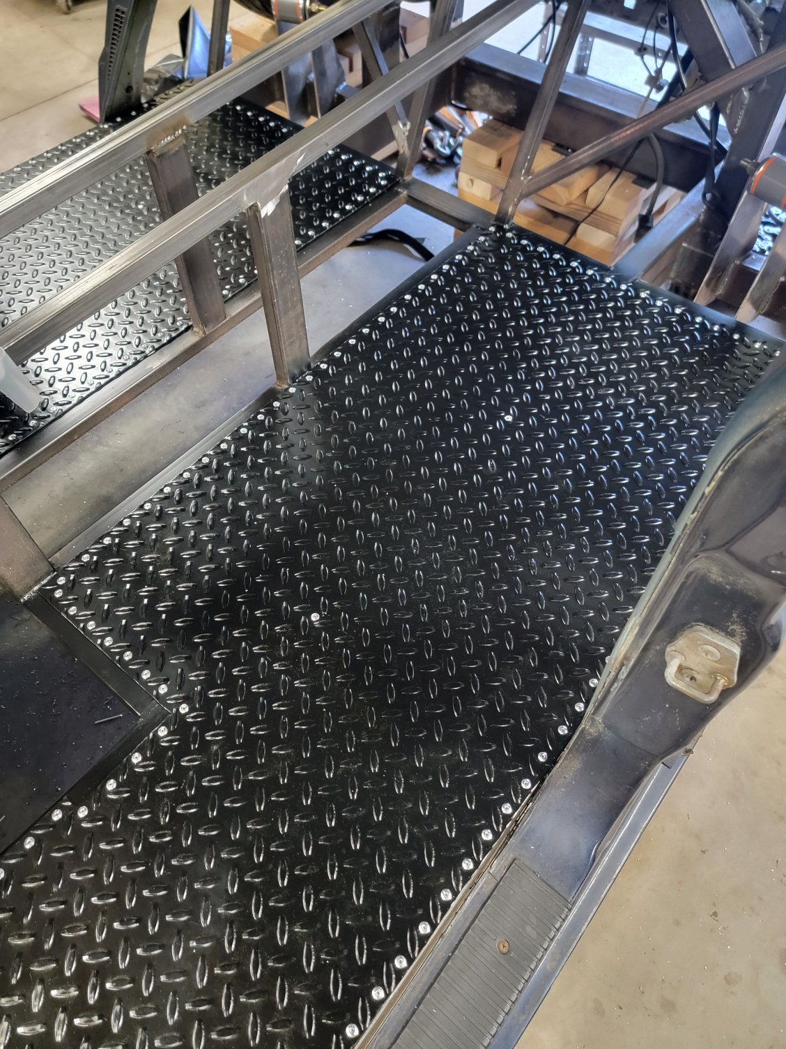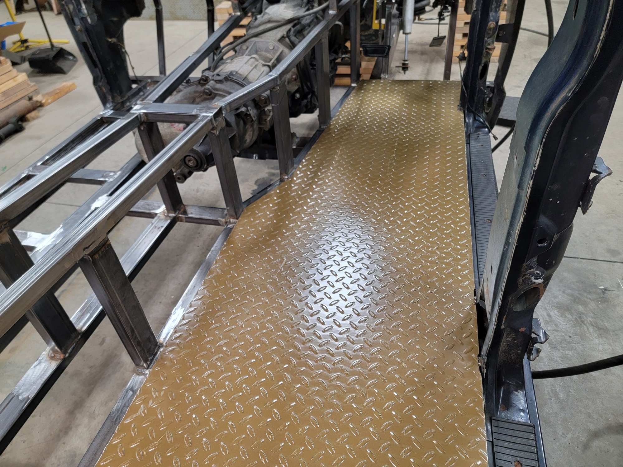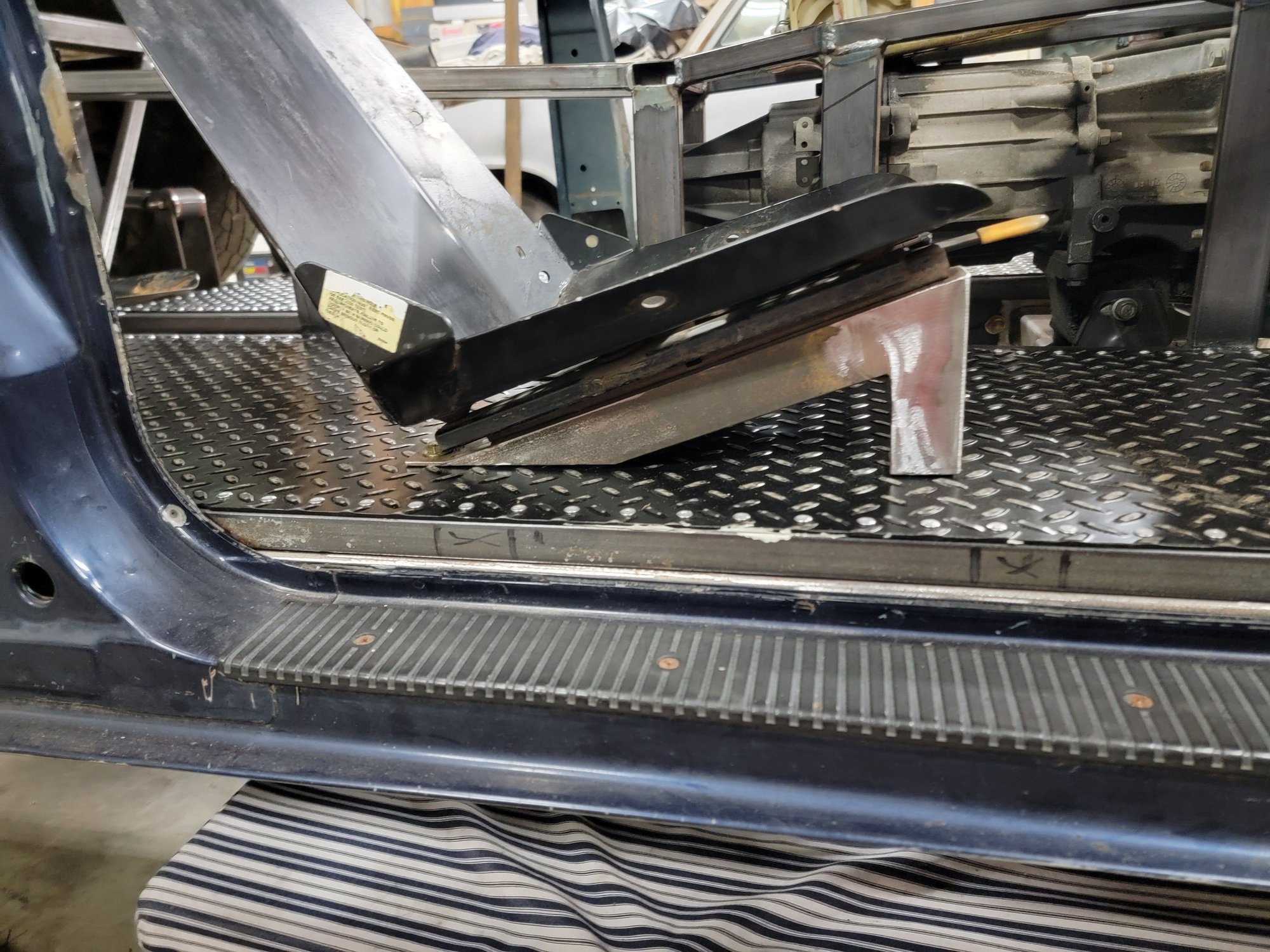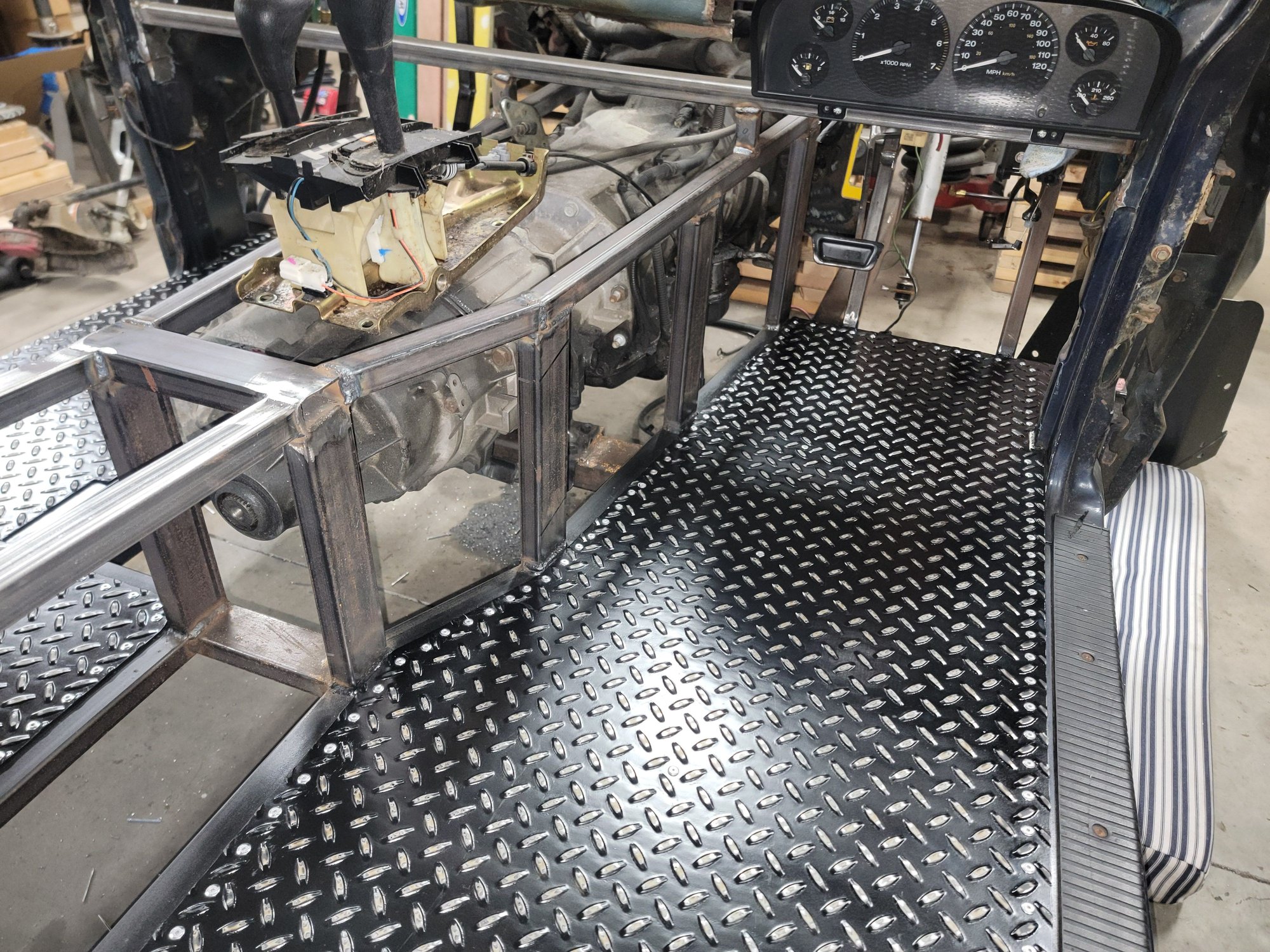 Sorry for no updates, been out for a surgery and wasn't able to do anything till this past week. Finally was up to working again and got the floors painted and installed. 293 rivets later and they are looking good! Got the new steering column loosely hanging where it is going to be mounted and the new steering wheel with quick release on it. Made seat brackets and started getting the seats installed and tonight the new battery mount came in so I went ahead and installed it as well.