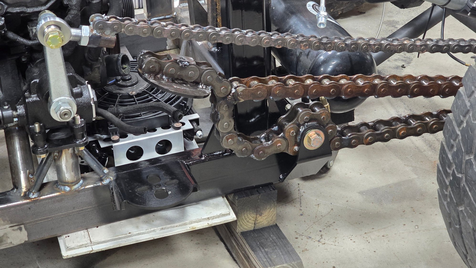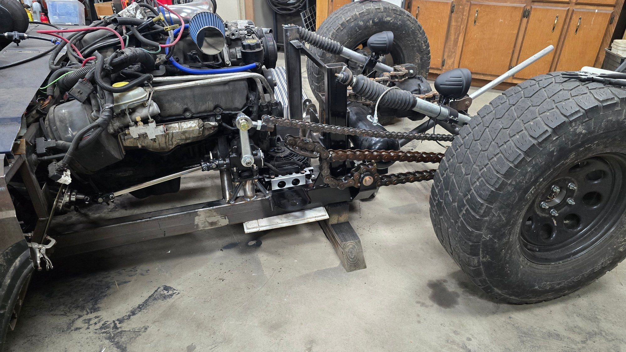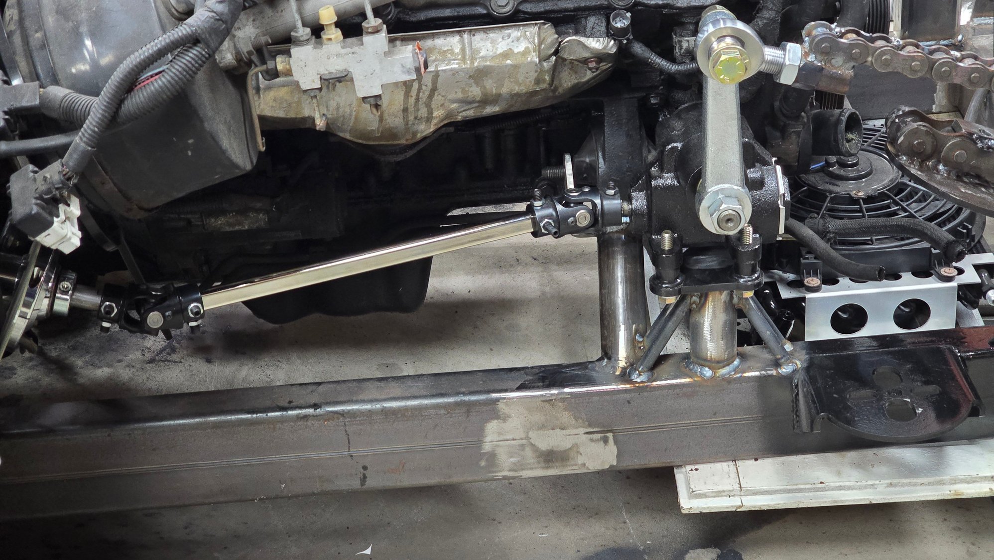 Haven't gotten to much more done but I did get the permanent motor mount made for the right side and the steering box is now mounted and hooked to the column. Also added some reinforcement to the vertical tube the shocks and radiator are mounted to. Clear coated the right side lower control arm and painted that corner of the frame so I don't have to remove the suspension again to do it later. Also got the front shocks and headlights mounted. Ignore the mess of wires lol we are in the middle of insulating another section of the shop and doing some rearranging/organizing.