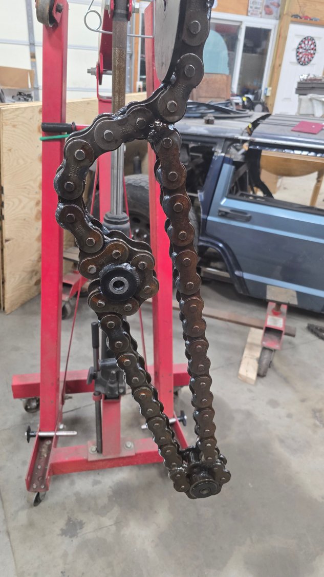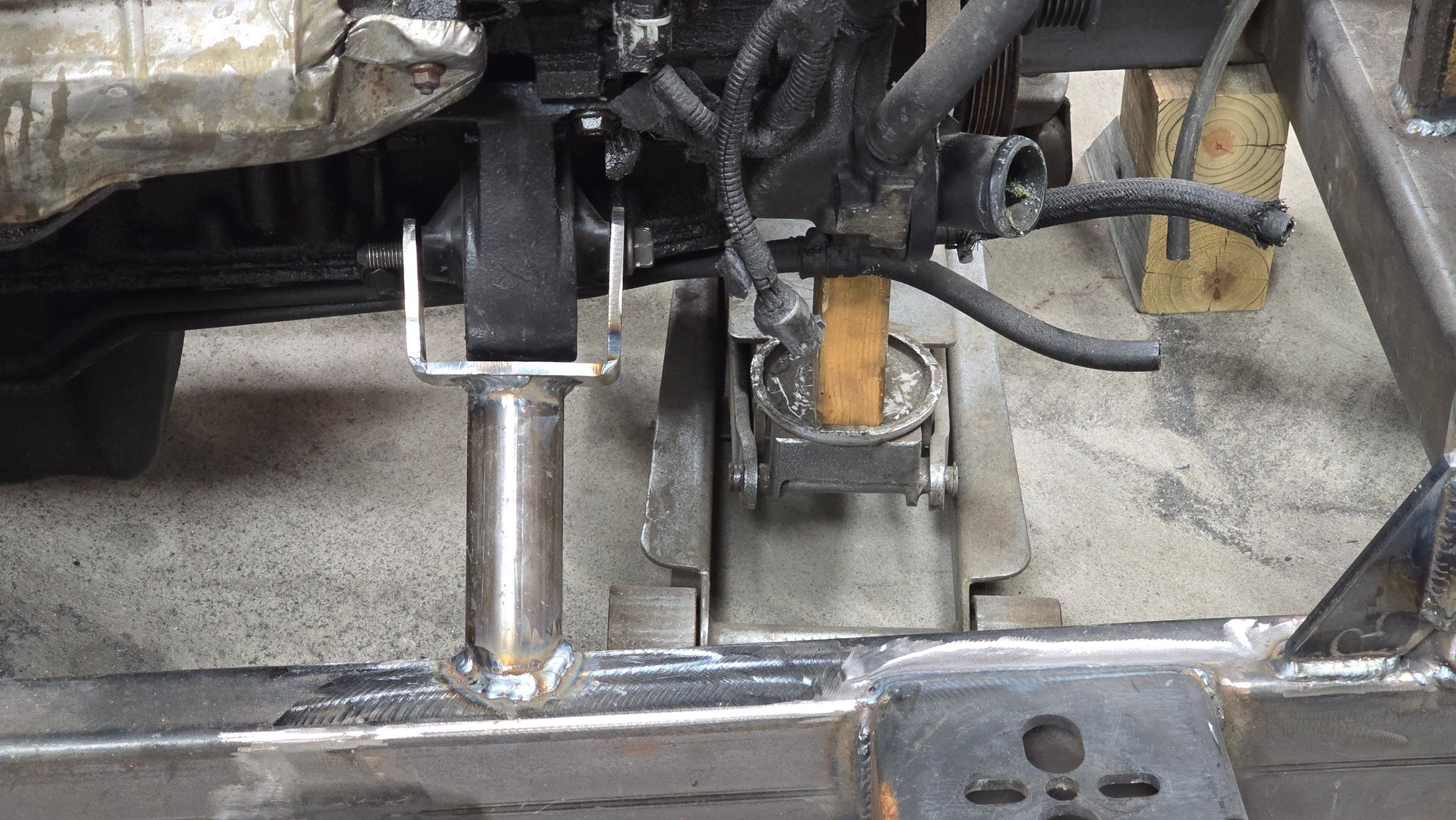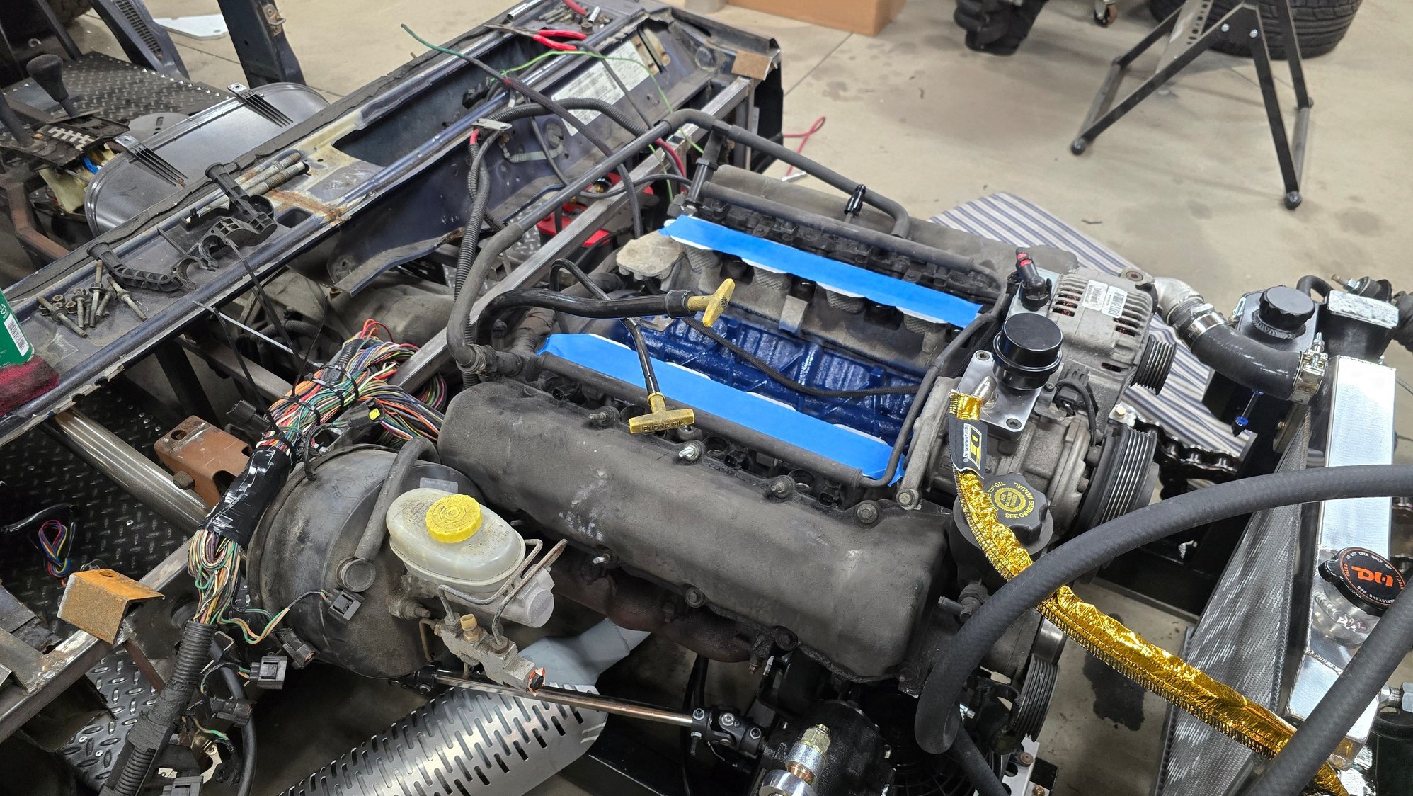 Haven't gotten to much more done but I did get the permanent motor mount made for the right side and the steering box is now mounted and hooked to the column. Also added some reinforcement to the vertical tube the shocks and radiator are mounted to. Clear coated the right side lower control arm and painted that corner of the frame so I don't have to remove the suspension again to do it later. Also got the front shocks and headlights mounted. Ignore the mess of wires lol we are in the middle of insulating another section of the shop and doing some rearranging/organizing.