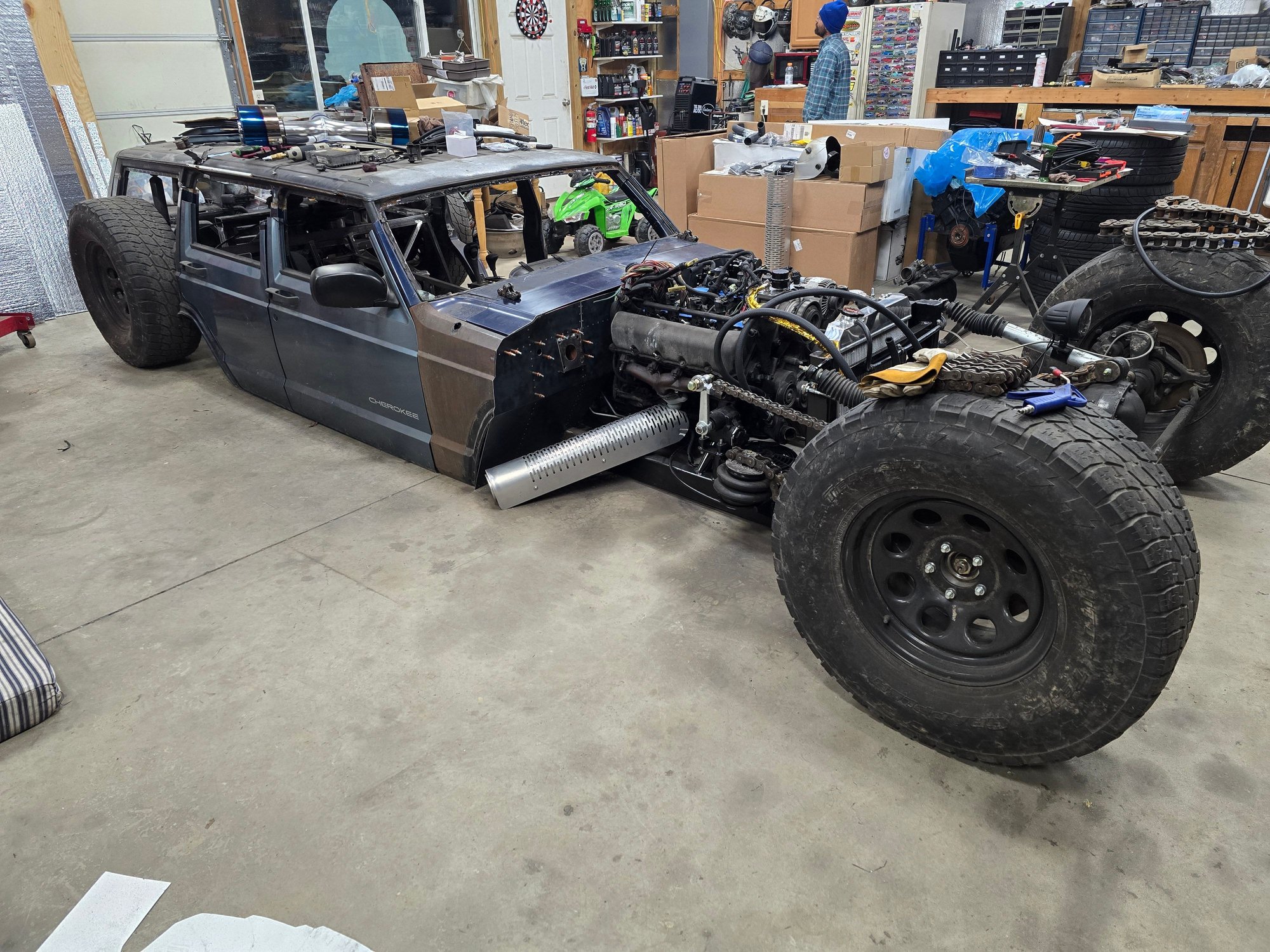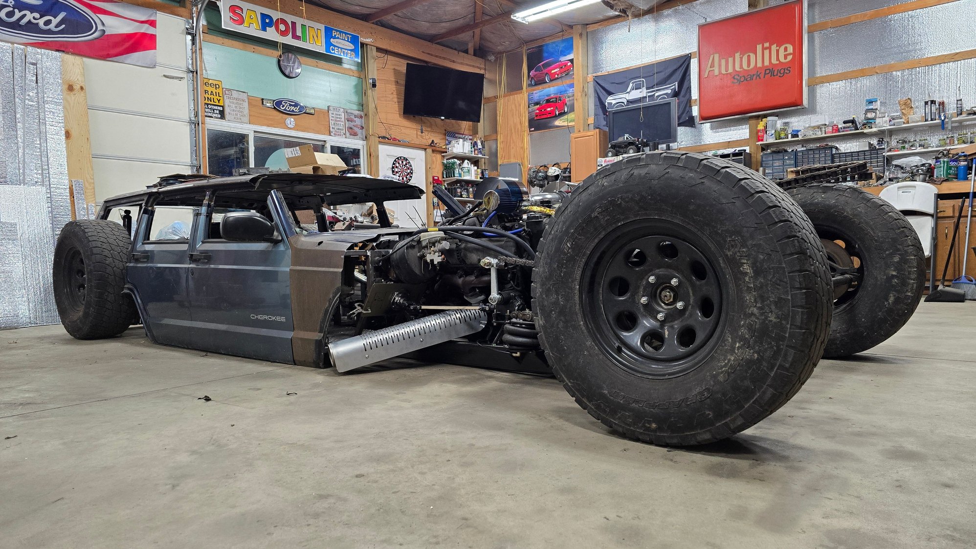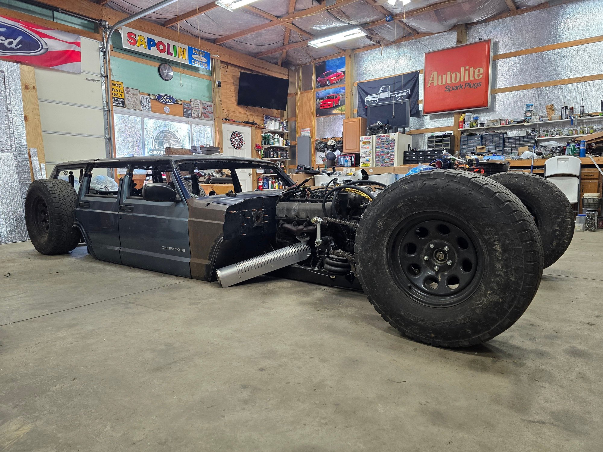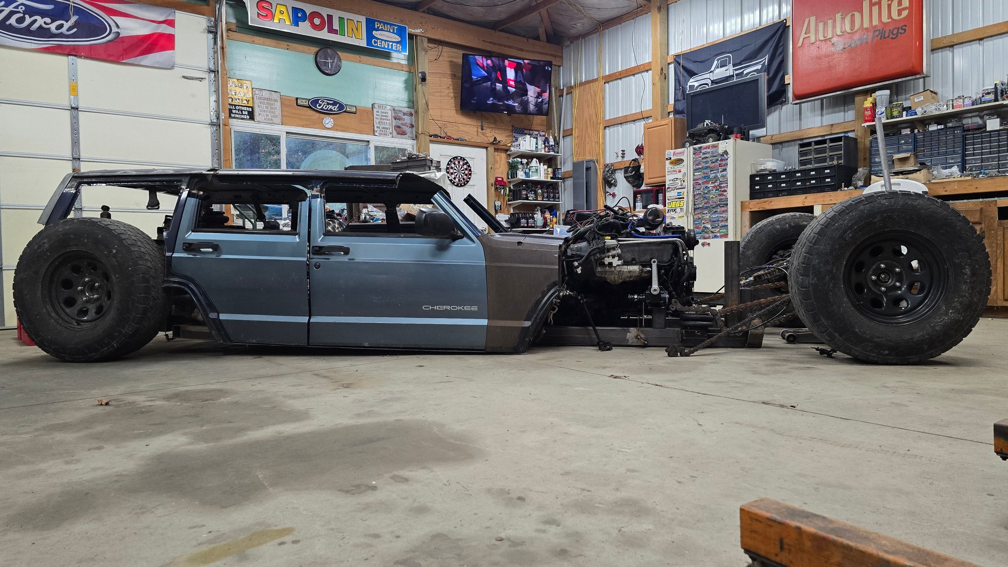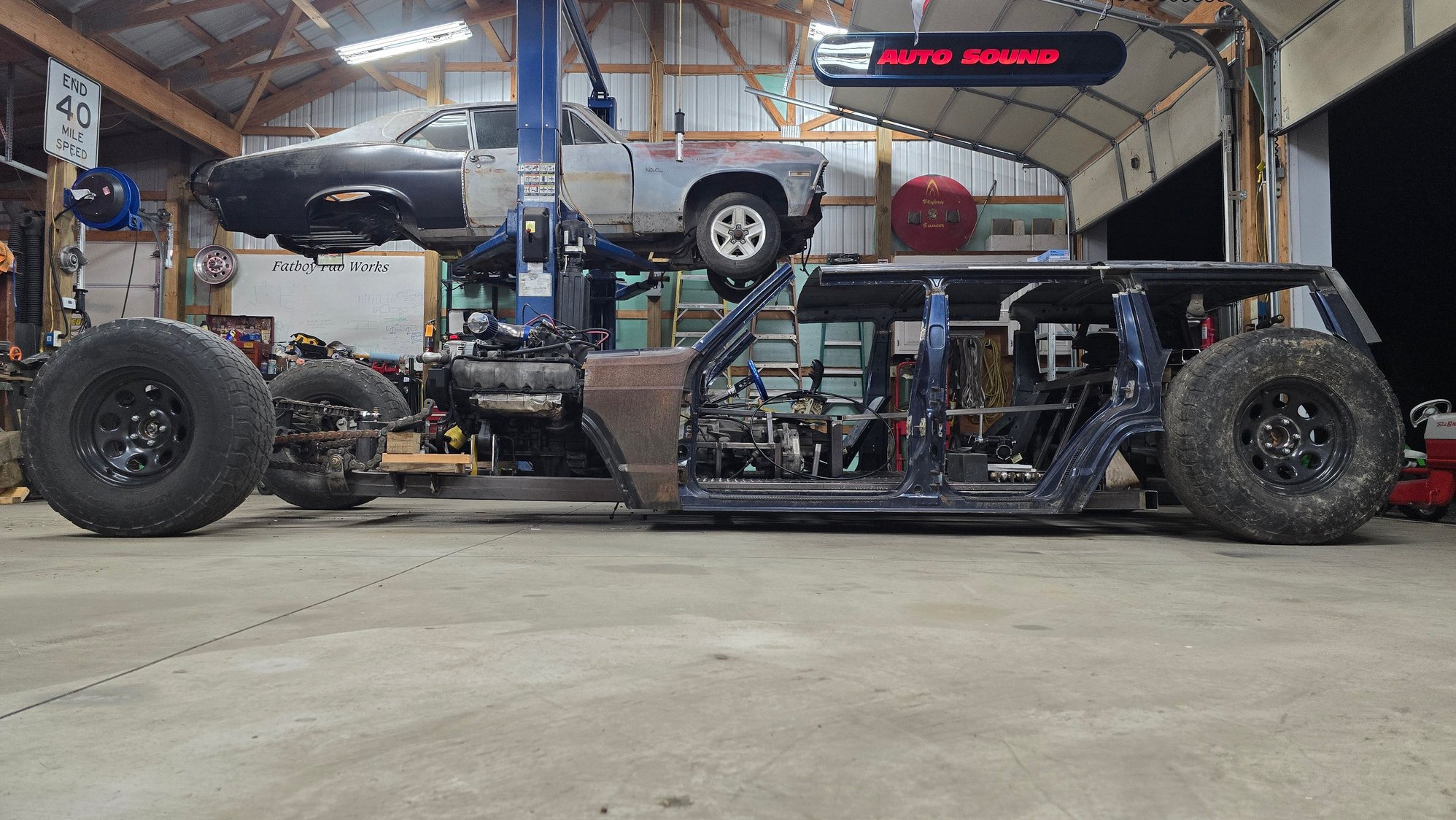 It's moving a little slow at the moment. Have a customers car in being built that takes priority. But it does roll now, and I sat the doors on it to see what it looks like with more body metal on it haha