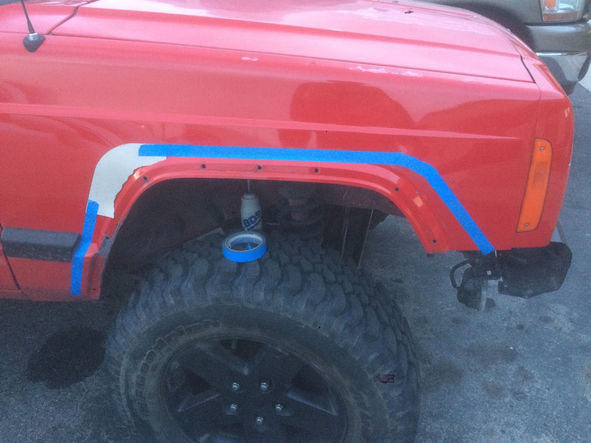 Next I went about modifying them to work. First I cut one of the flares in half. Then I taped off where I wanted the flare to be so I could get my measurements. I ended up opening up the angle of the front bend of the flare and then shortening the entire flare by a couple inches. Then I tapered the front in to line up with the body. Before I tapered the edge in I had cut the flare to match the curve of the body. I attached the flare with some tabs that allowed a nut and bolt to go through holes cut in the actual fender of the Cherokee. The last thing I did was had the flares power coated black. For the back edge I ordered some rubber u-shaped channel and pinched it between the flare and the fender. Over all I am very happy with how they came out in the end!