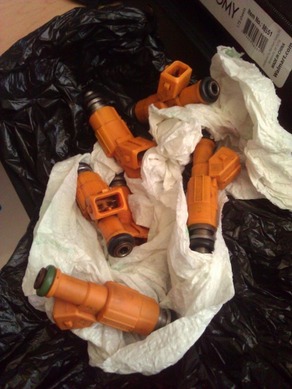 Well yesterday I got my injectors in the mail!They're 710s and look great just need to do a last spray on them. I had to file out a complaint to paypal and they emailed him so I feel like even though I had emailed him days before the claim, paypal got his attention more. One way or another as long as I got them I didn't care but here they are! There are six I just didn't uncover them all when taking the picture