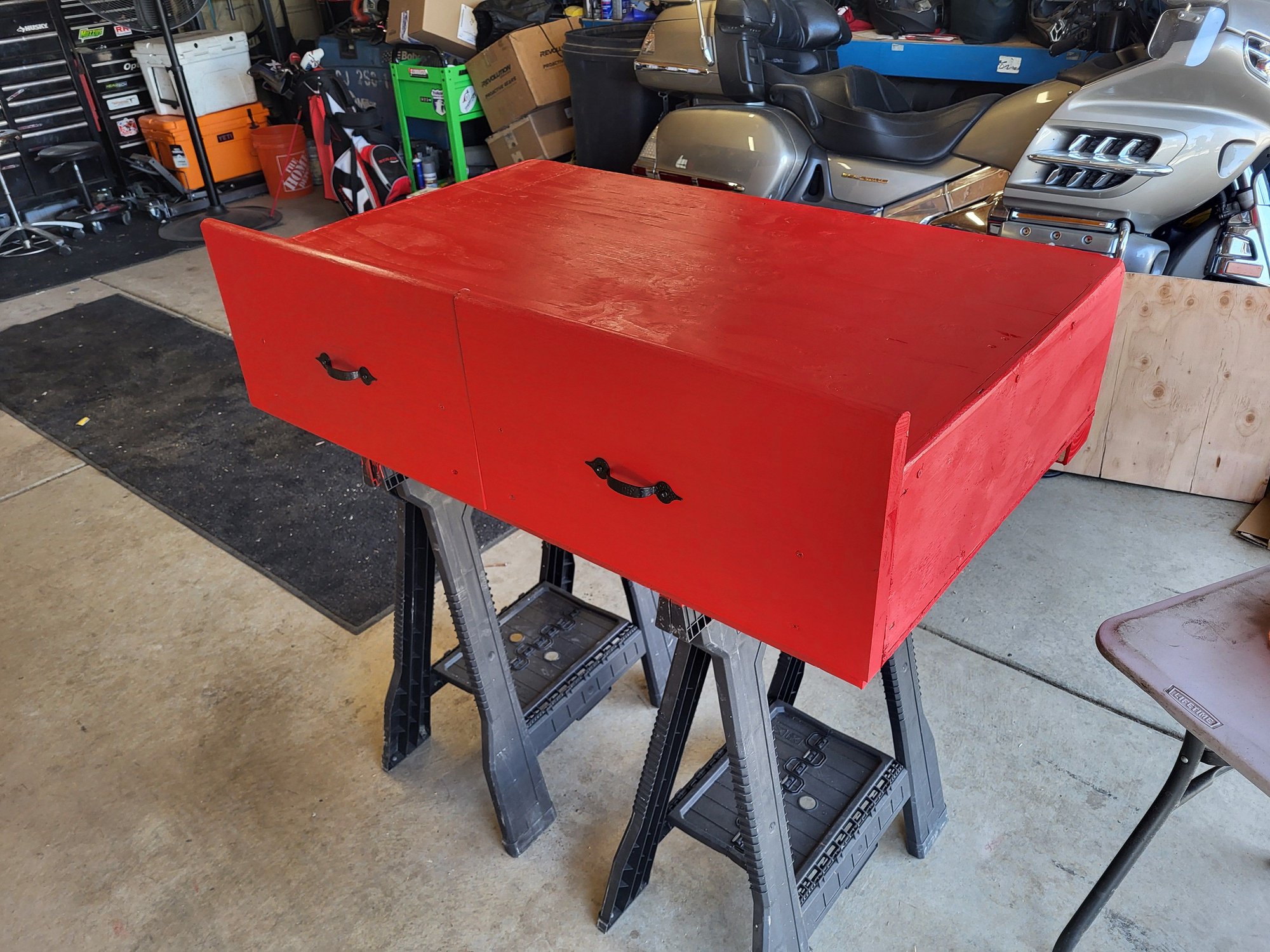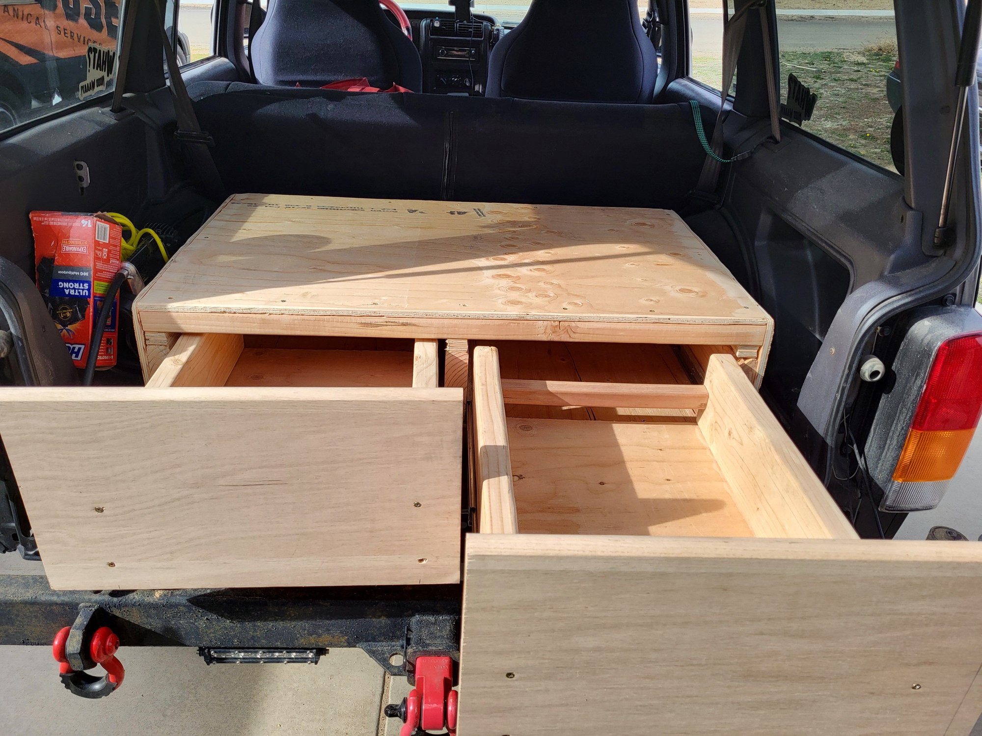 Needed more storage. Tools and parts in one side, recovery gear in the other. Mounted the air compressor on top. Still room for cooler, table and what ever on top. Way over built.
