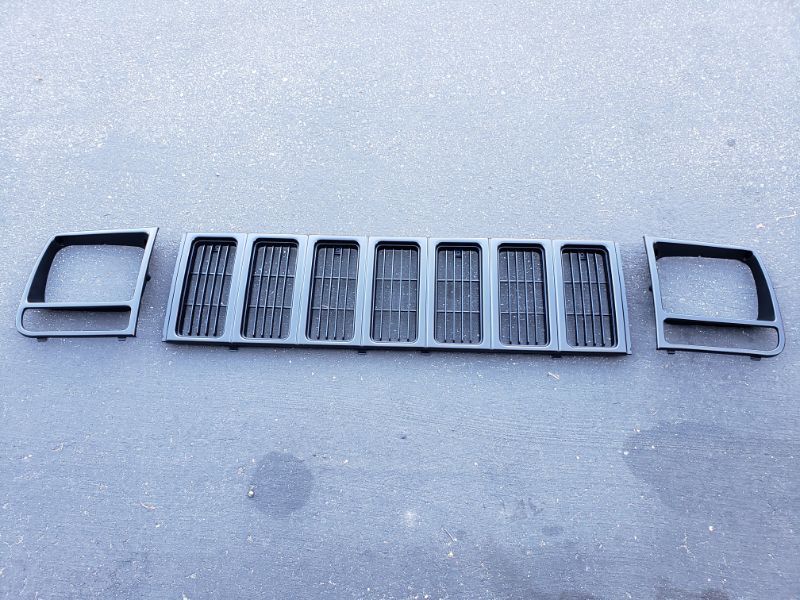 I have a 1998 Jeep Cherokee Sport 4.0 2WD. The body trim and front grille are a bit tired, and I'm going to try something different: I'm going to repaint them all, but I'm going to paint the trim the same deep black with gloss as the grille. Here's what I've got so far:
