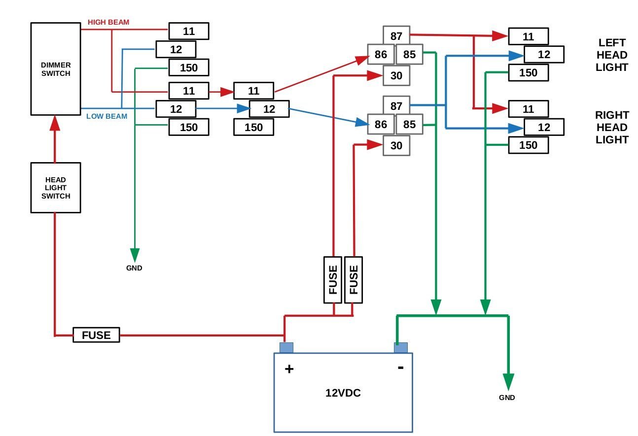 gauge for the relay triggers. Two forty amp auto relays, two inline fuses for the primary feeds to pin 30 on the relays,