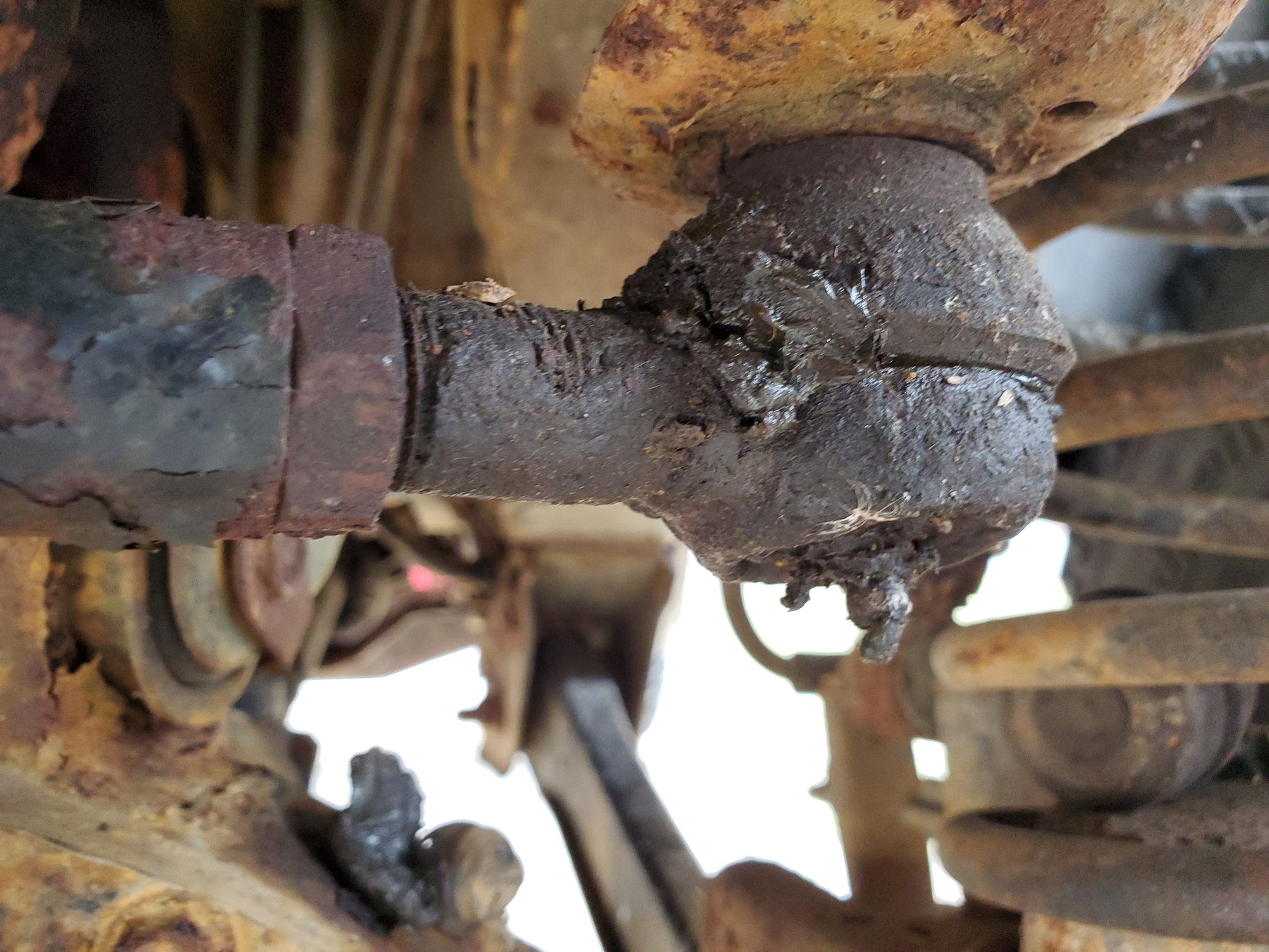 Man... looking at your rig makes me thankful I live in sunny dry California. Lots of rust down there! Make sure you tend to that rust as well, or you might find more slop in other areas once stuff starts breaking apart. While you're fixing things, put some air in the driver's side tire of that skittle back there too