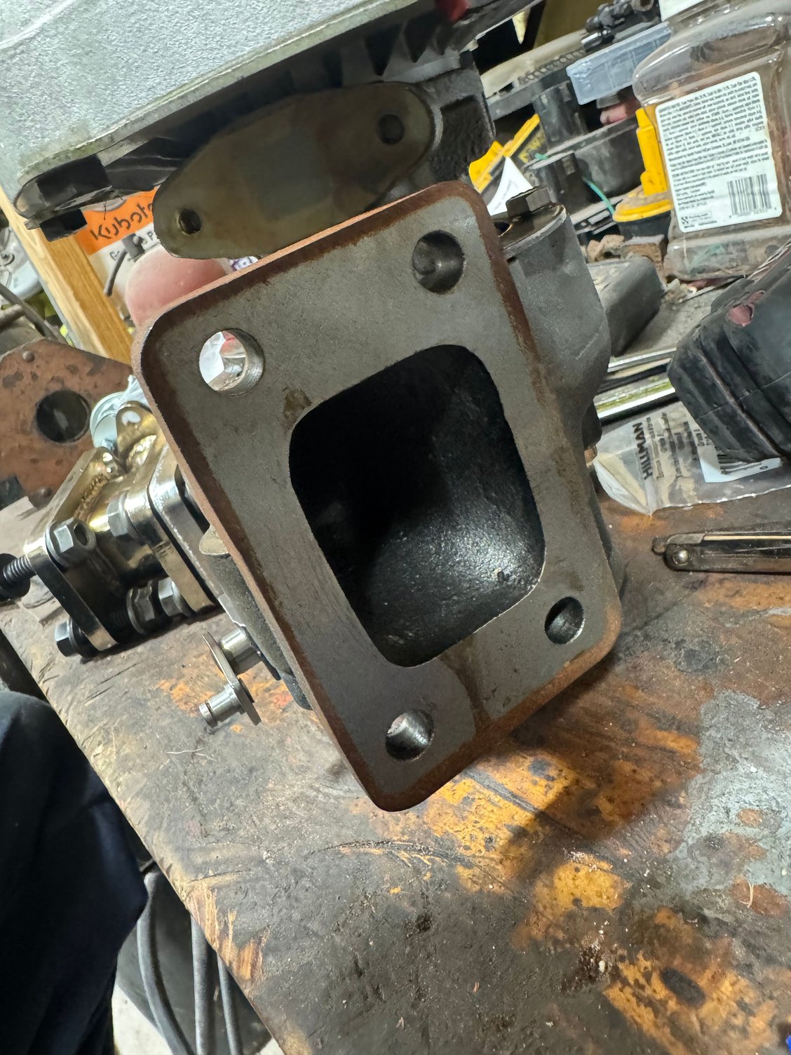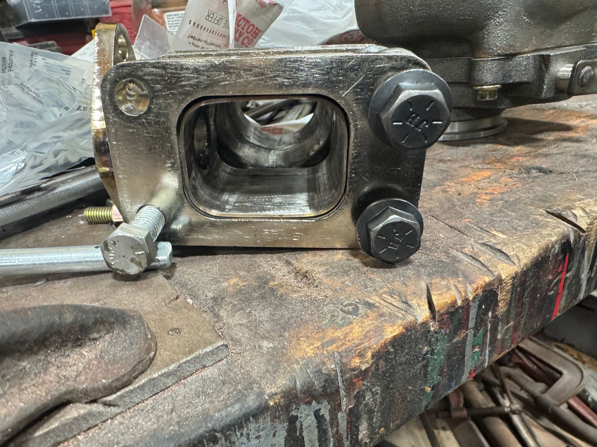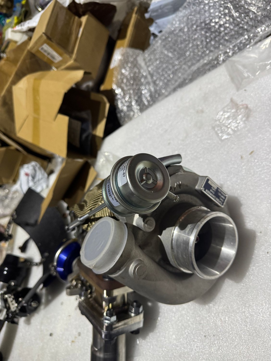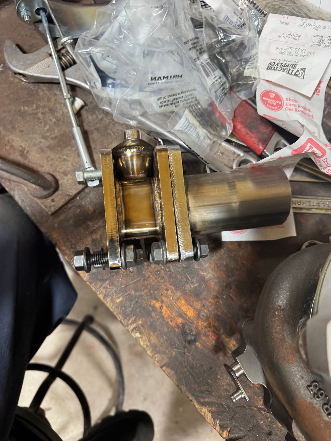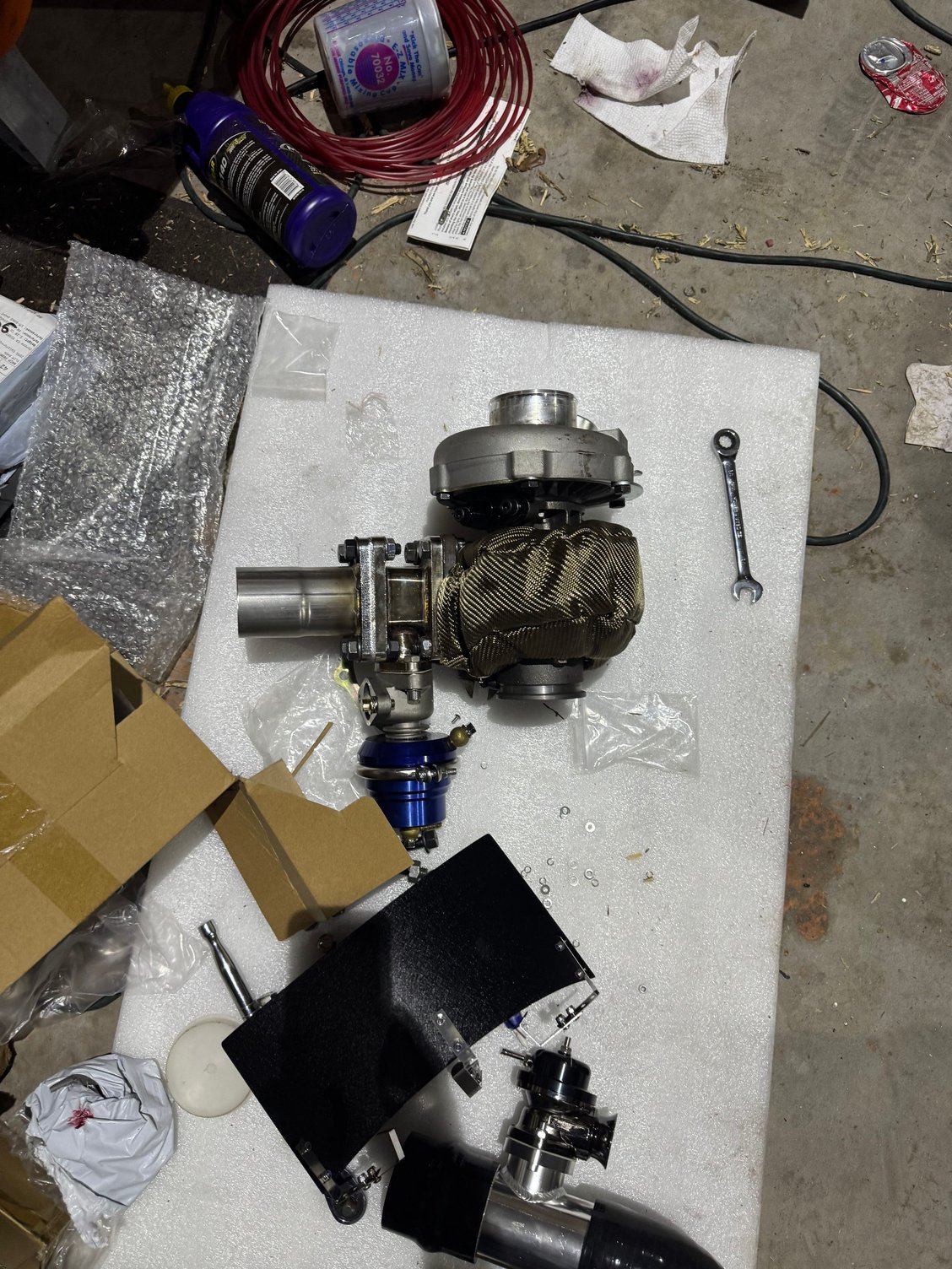I attempted to use a cheap watergate adapter and it was the most difficult part of the install. After I finally forced it to work, the location of the watergate is hitting the intake manifold. I will need to just weld in a pipe for the watergate in a different location. I plan to replace the fuel rail and run a new fuel line with an external pump. Hopefully this will allow me to control fuel pressure with a boost sensitivity fuel pressure regulator. If the regulator is not enough, I plan to install an FMU probably 12:1 ratio. I’m initially going to set timing to 6 degrees and work from there. I have hp tuners and it lists the Cherokee on the programmable processors. Maybe I can change timing or fuel tables there as well. My plan is to keep boost at 6psi. I’m not trying to race this xj just keep speed in the mountains. I may need to swap my msd for a boost retard model but I’m trying to keep budget low. I will list some pictures of last nights progress and failures. The exhaust side is on left and hot side on the Rt. The watergate is hitting the intake manifold. SMH The intake with bov are just production pieces from temu. I installed an internal watergate for safety. The watergate in blue will need to be relocated. It’s clocked for my application with oil drain on bottom and compressor outlet pointing upward. Air filter and heat shield also gained from temu. 85% of this project has come from temu so far. Heat shield and charge pipe with blow off valve. Bov This piece was nearly impossible to install and now to be removed after 2 hours of modification. Nuts and bolts cut and ground into position Pic of turbo tag. China knock off Compressor a/r is .5 Exhaust side a/r
