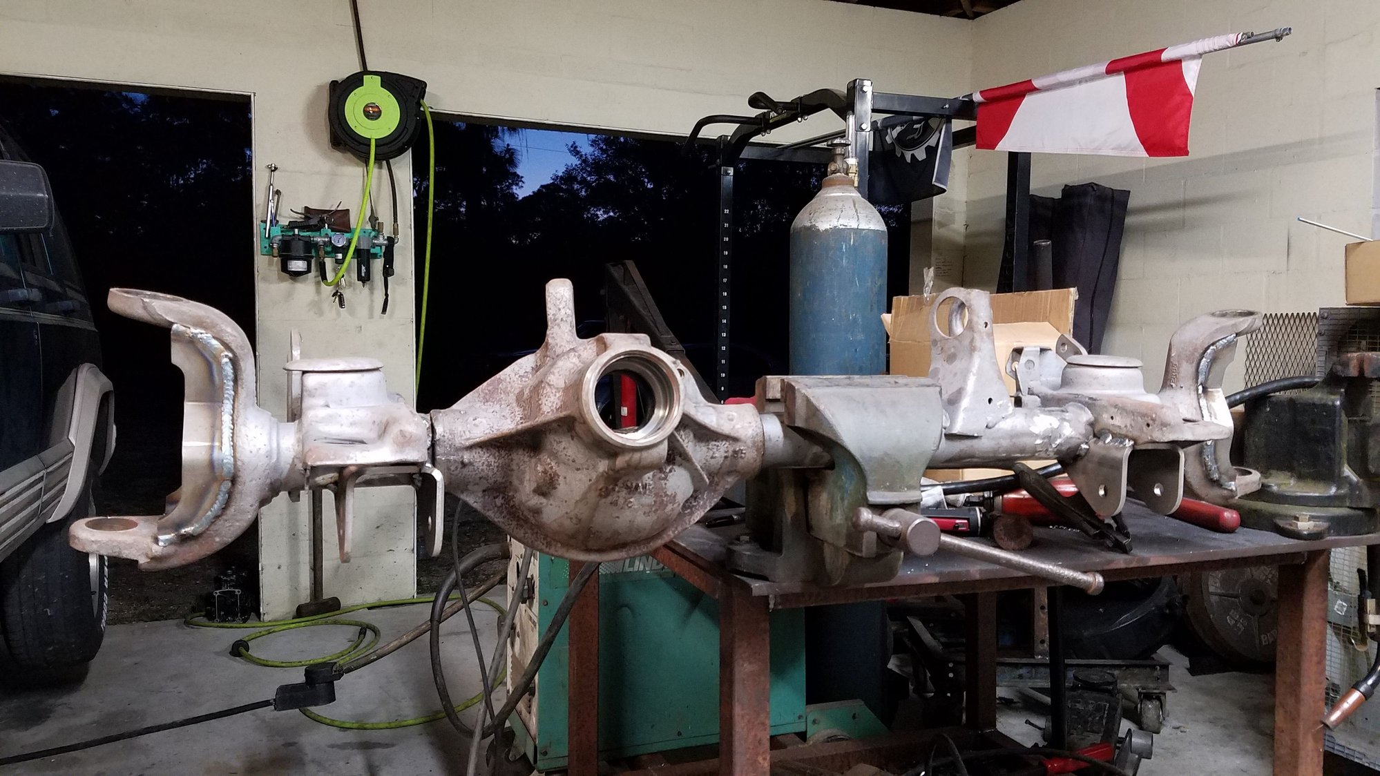 Coming along nicely. Did you sandblast that in the yard w/ a portable unit or do you have access to a blast cabinet that large? I have already shown in this thread I am fairly ignorant to axle modifications typically done in a 4WD application. That said, it appears you didn't do any plug welds through the stock axle tubes to the inner sleeves. I have seen that done when adding inner sleeves, why didn't you drill numerous holes and plug weld to the inner sleeve?