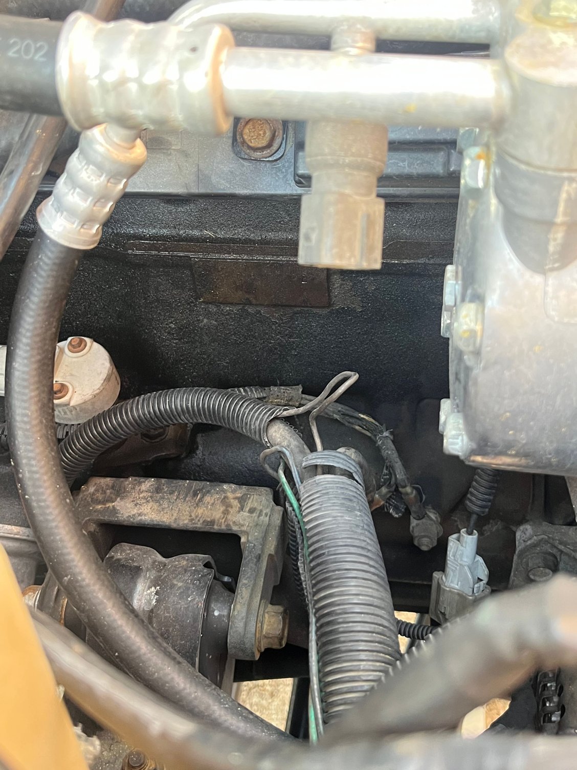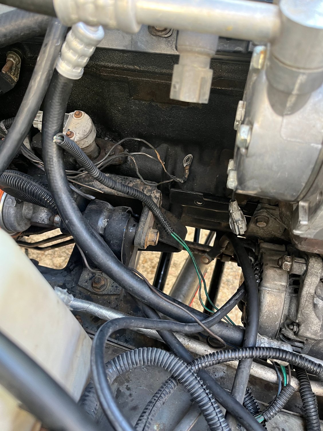 First off, the large wiring harness behind the AC compressor and alternator had to be altered and out of way. I rerouted and shortened many wires and cables such as the starter cable and AC wires, alternator wires and engine block grounds.