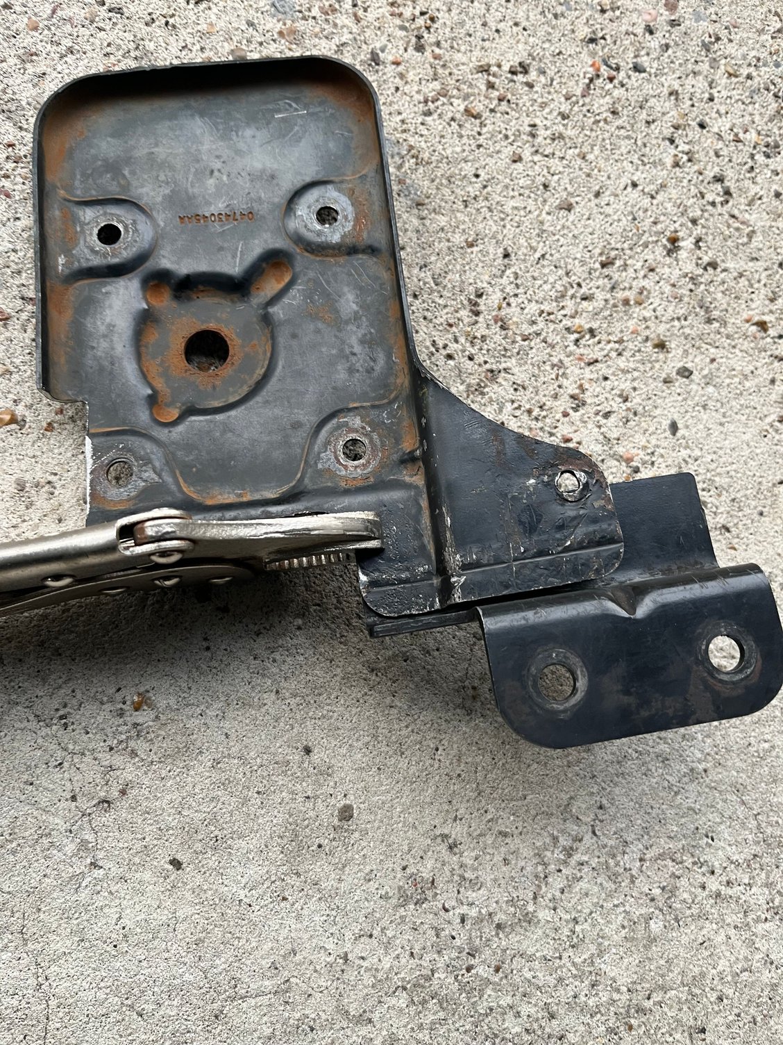 Since the van bracket tab is not flush with the XJ bracket I clamped the two brackets together to use the hole near the vise grips as a starting point. I marked and drilled that hole into the van bracket. Then I marked as best as I could for the second hole to drill and it came out fine. To fill the gap I used a nut as a spacer and also trimmed the bolt later on.