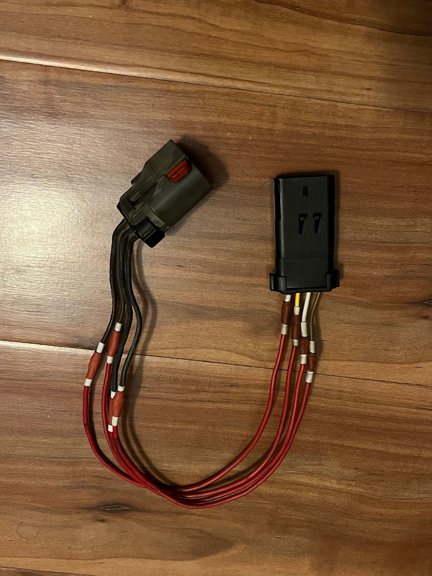 Here is what I meant. Cut the wires then turn the red tab connector facing down, then connect the wires straight across. Purple to brown, yellow to white, white to yellow, brown to purple.
