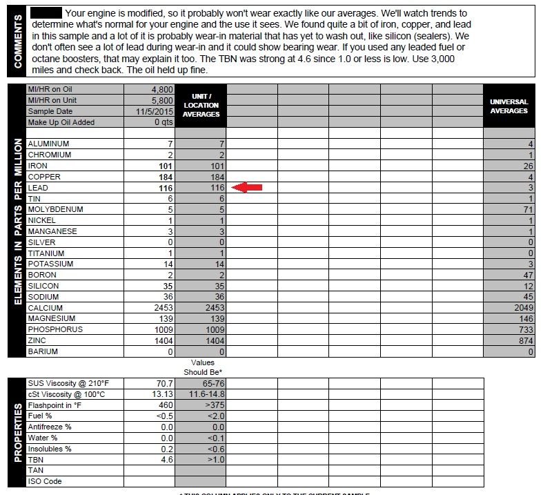Now I just received my first oil analysis at 6000 miles. Most of the numbers were okay, except for an alarmingly high lead content of 116: