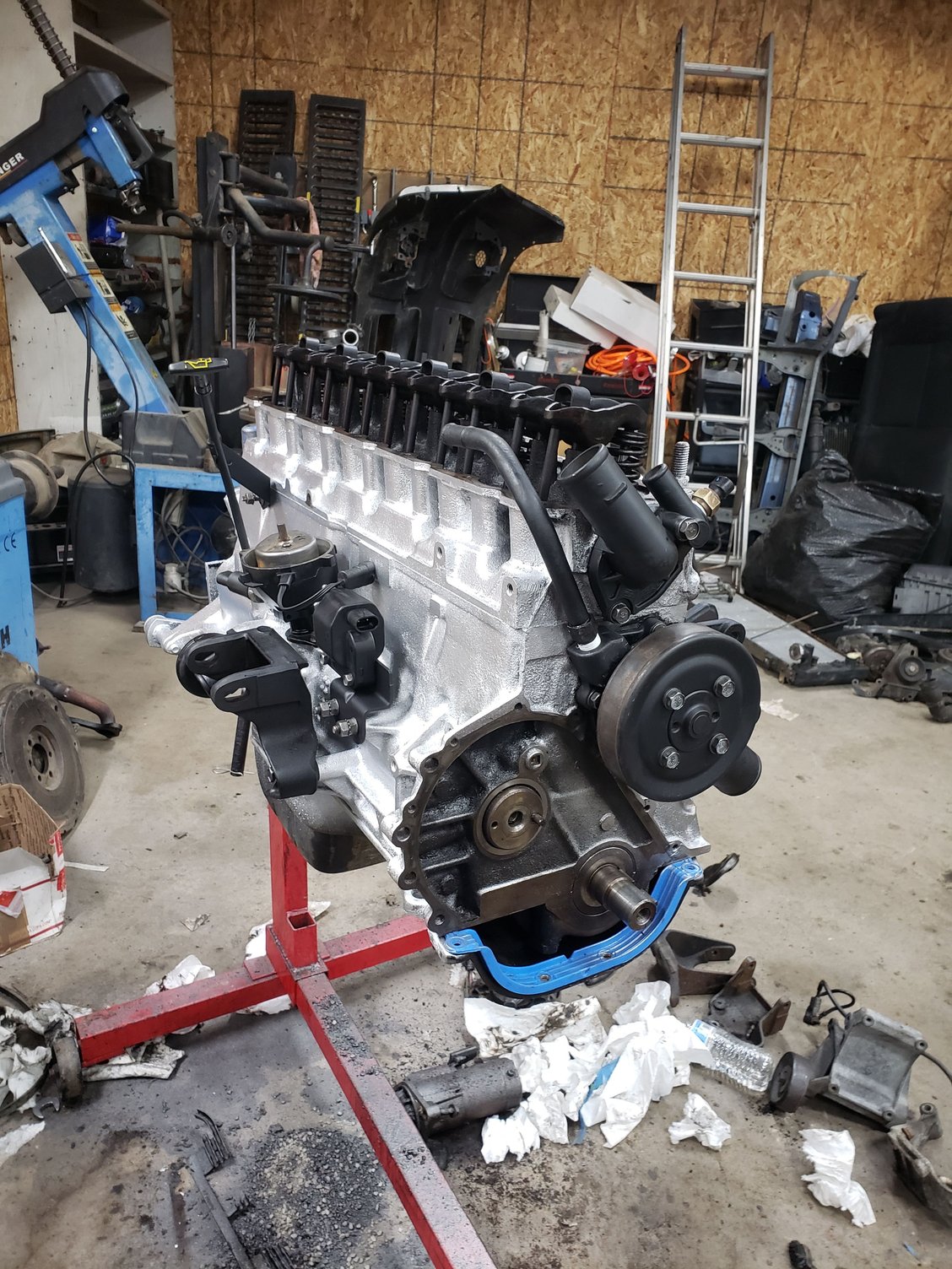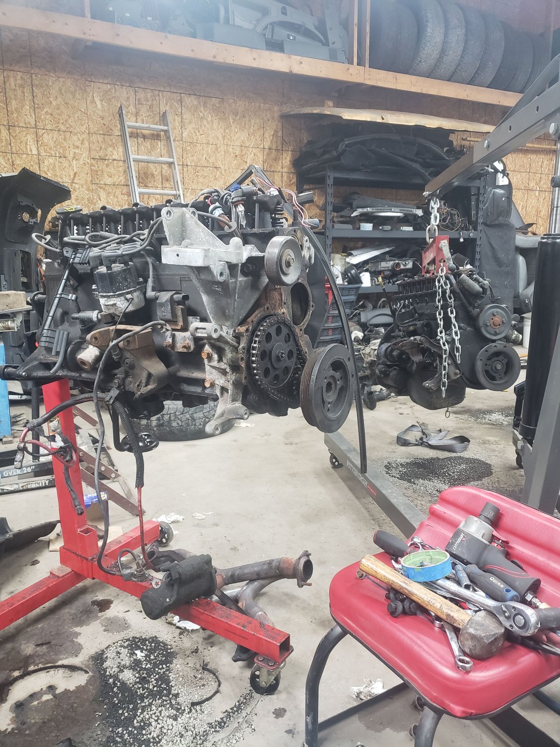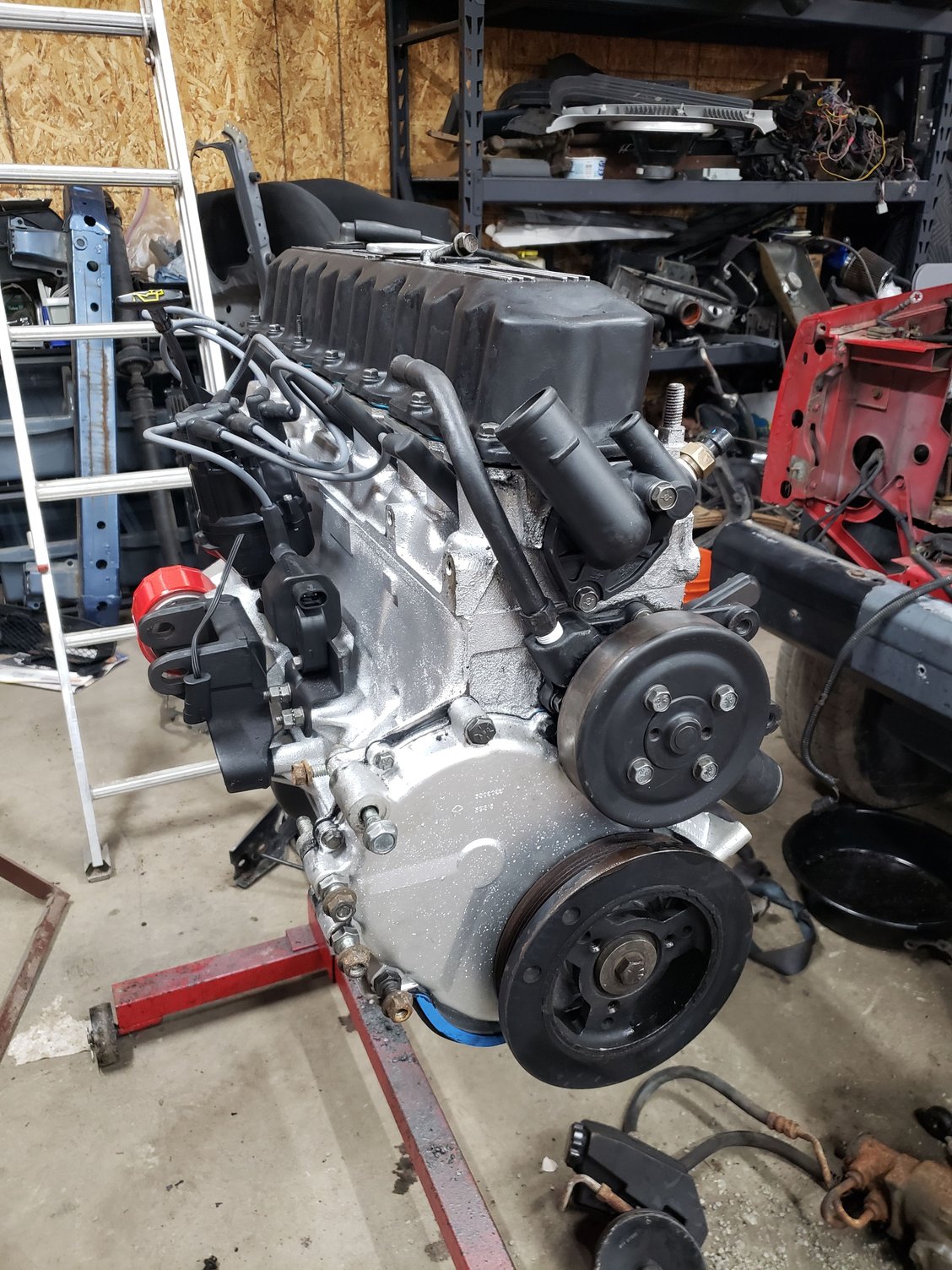 Motors full of oil and is gonna get a transmission hooked to it this weekend. Did some junkyard buying today. Got a tilt wheel steering column, cluster, black interior panels for dash, and seats to replace my daily's seats that will go in this.