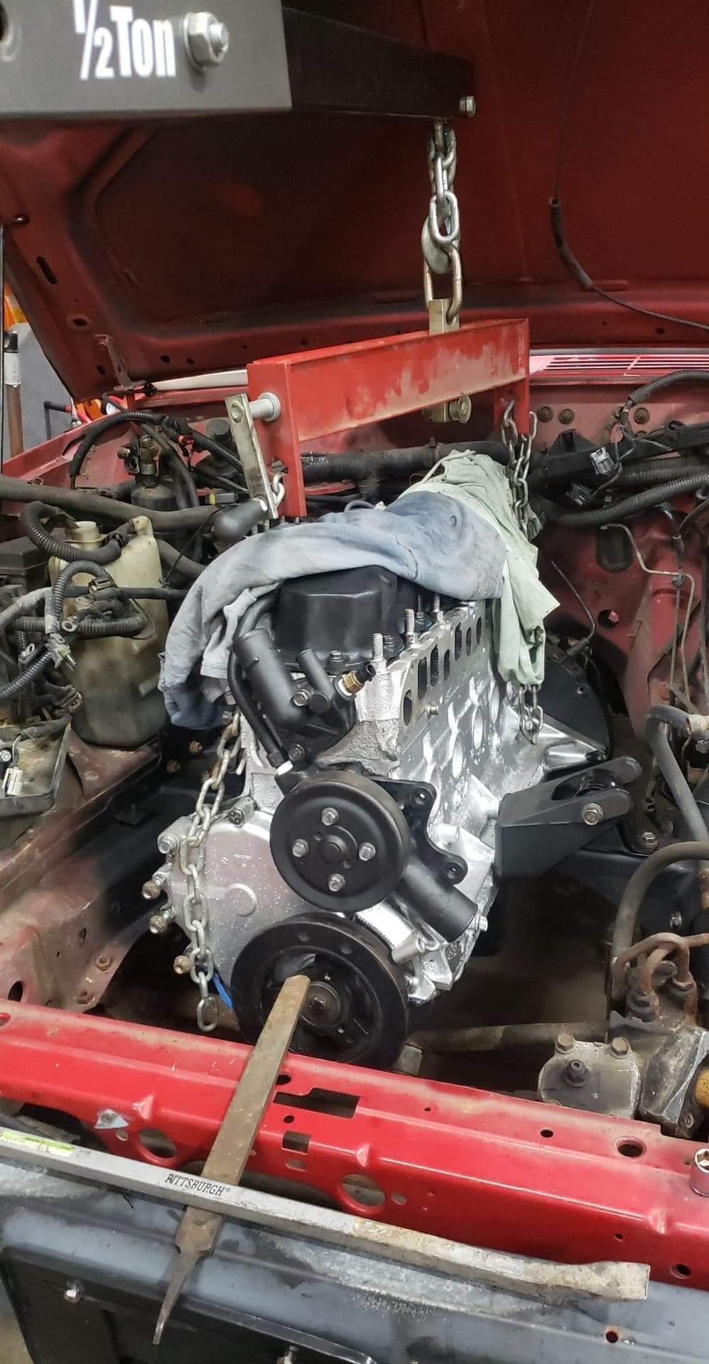 Motor mounts are bad. Got some on order, other than that, the motor is completely ready to go back in. Headers welded, intakes all painted. New distributer cap, rotor, and wires are installed. Have to clean and coat frame rails in engine bay with paint. Still dont know what yet.