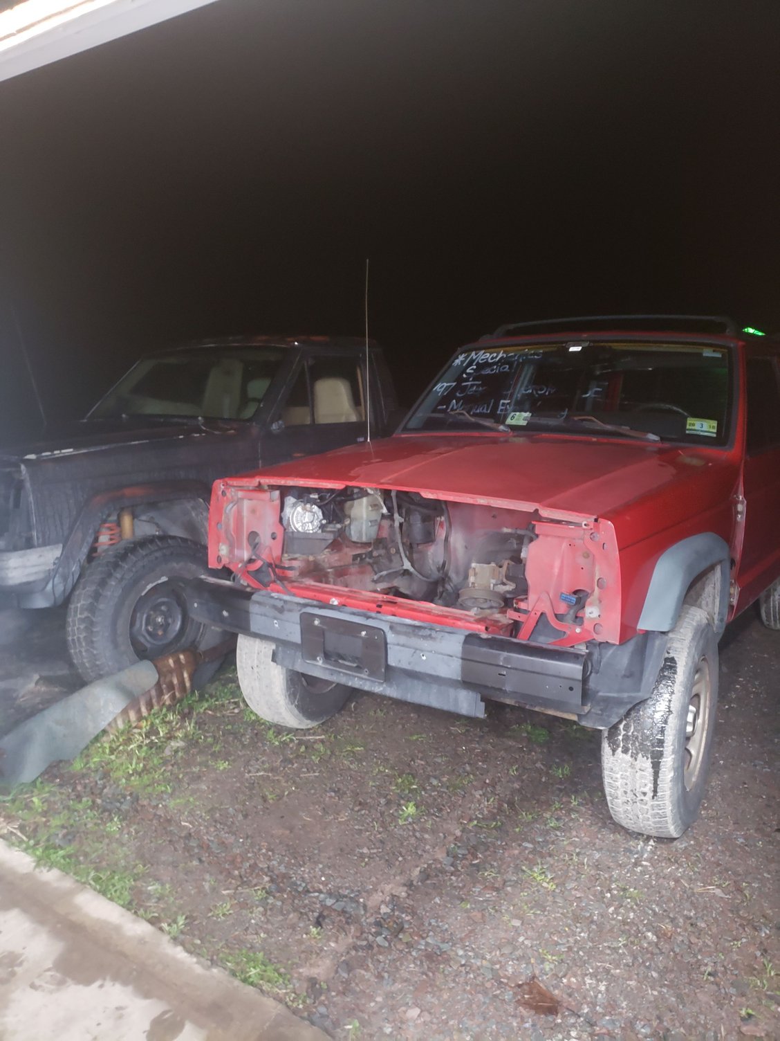 Been busy working in my shop making some money for the project. BUT progress has been made. Parts jeep was filled up with scrap(after this picture) and sold. I sold it to a scrapper who paid me 125$ for it. Lots more than i would've got scrapping it on my own. Couldnt be happier the way that went. Paid 200$ for the jeep, kept drivetrain, sold 250$ ish worth of parts off of it, and in the end sold it for 125$. Made about 175$ off of it and got a motor, trans, and transfer case out of it. Also pulled the knocking motor out of the other jeep. Im still gonna call it rod knock. Ready to pull Pulled! Sitting next to the comanche 4.0 Junkie 😝