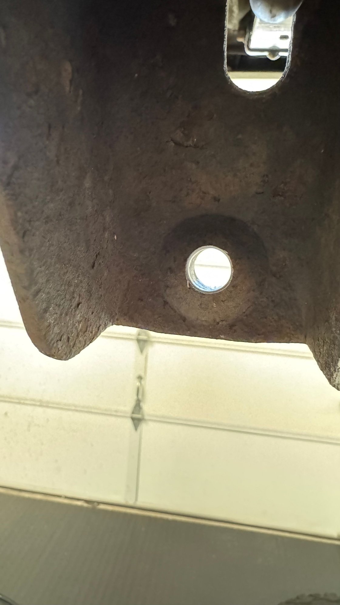 While removing the lower rear shock nut the threaded portion twisted off, leaving me with just the shock stud sticking out. After some research I decided to cut the stud off completely from the bracket and drill a 1/2" hole for the universal shock stud kit I bought from Summit. After cutting off and grinding flat I notice the outline of possibly a much larger hole as you can see in the photos. I tapped on it with a hammer and sort of expected it to fall out the back, but it won't budge. I don't know if I've explained this right. Does anyone know what I'm talking about and whether that bracket is one solid piece? Thanks.