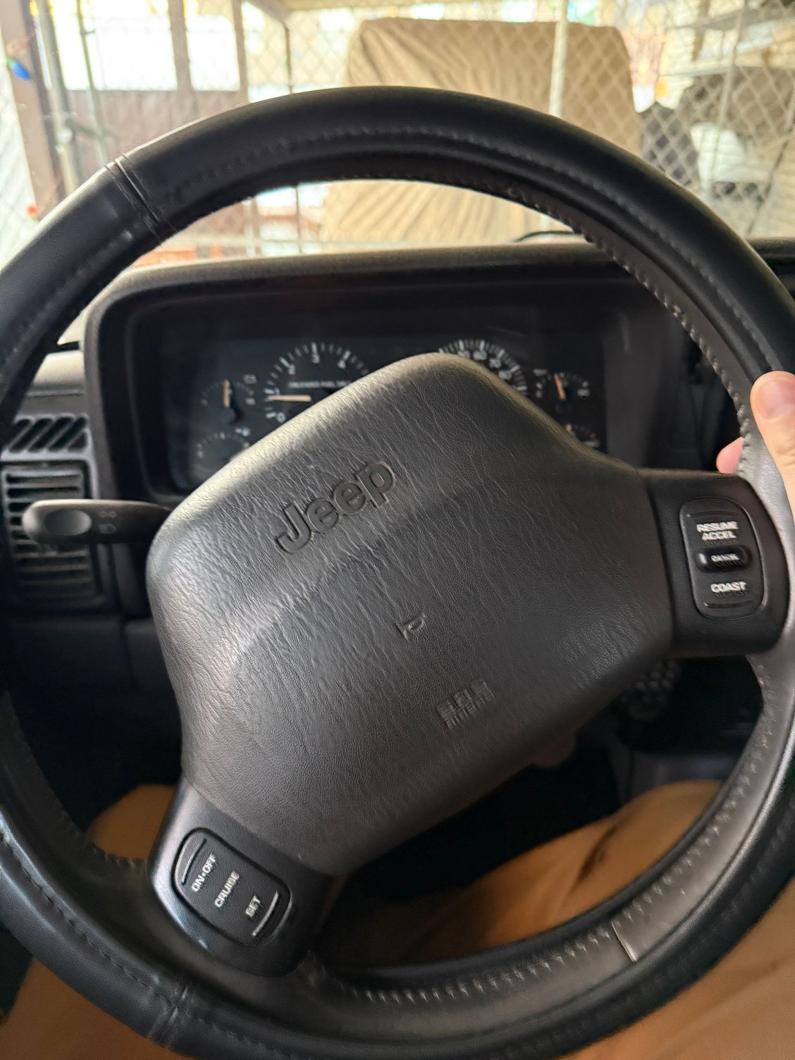 You should be able to adjust the draglink adjuster sleeve to rotate the steering wheel clockwise with the Jeep on the ground and the wheels pointed straight.