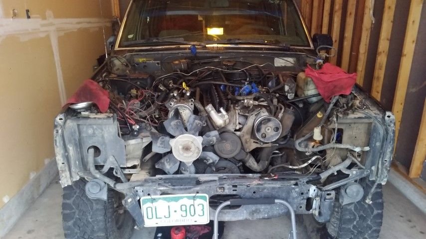 I know that i can run a HO with the Renix. The main reason i wanna swap it is i bought this jeep little over 6 months ago with the plan to do a rebuild, sliders, lockers, at least clean up my spaghetti wiring harness i have. The micro squirt really isn't that bad its just connecting wires Im sorry i cant resize these pictures at the moment. Pictures of my front grille snf rad off, along with my valve cover.
