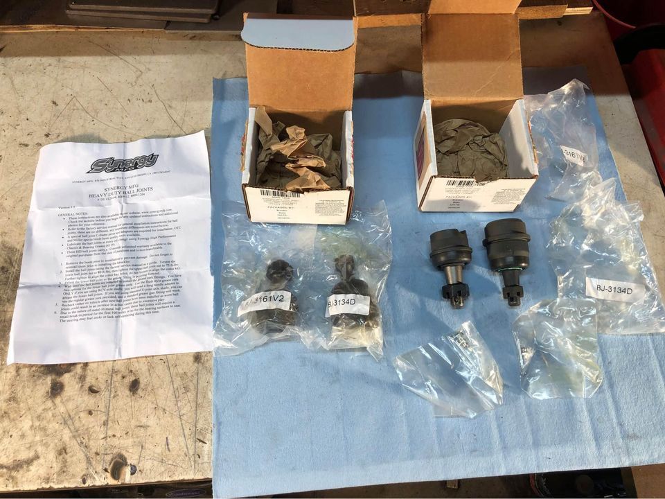 Synergy Dana 30/Dana 44 Heavy Duty upper and lower ball joints P/N 8009-1204. Bought these for a Dana 30 build that never happened. They have been sitting in boxes on a shelf for a couple years. Everything is in like-new condition. All pieces included in the kit are here.