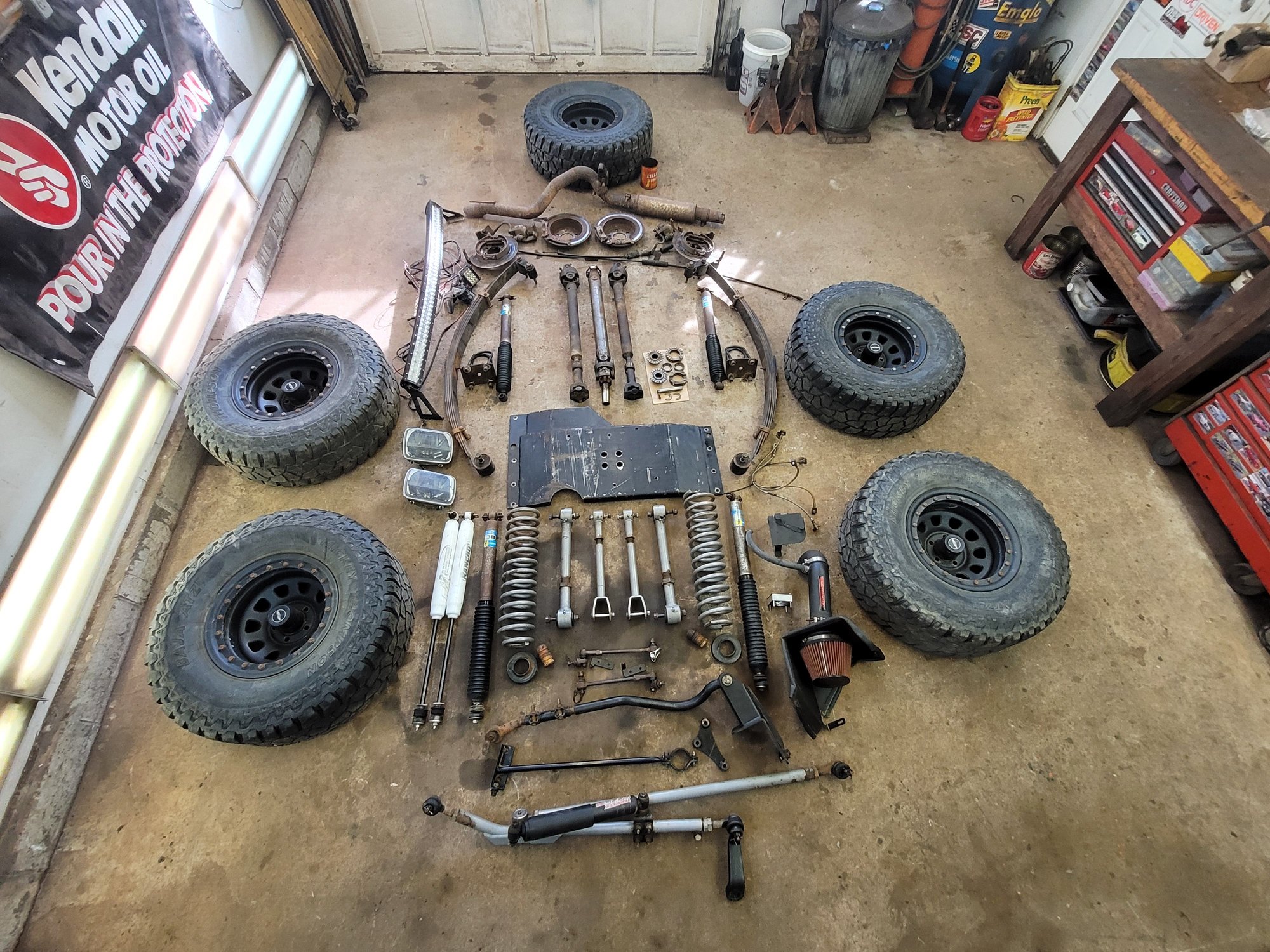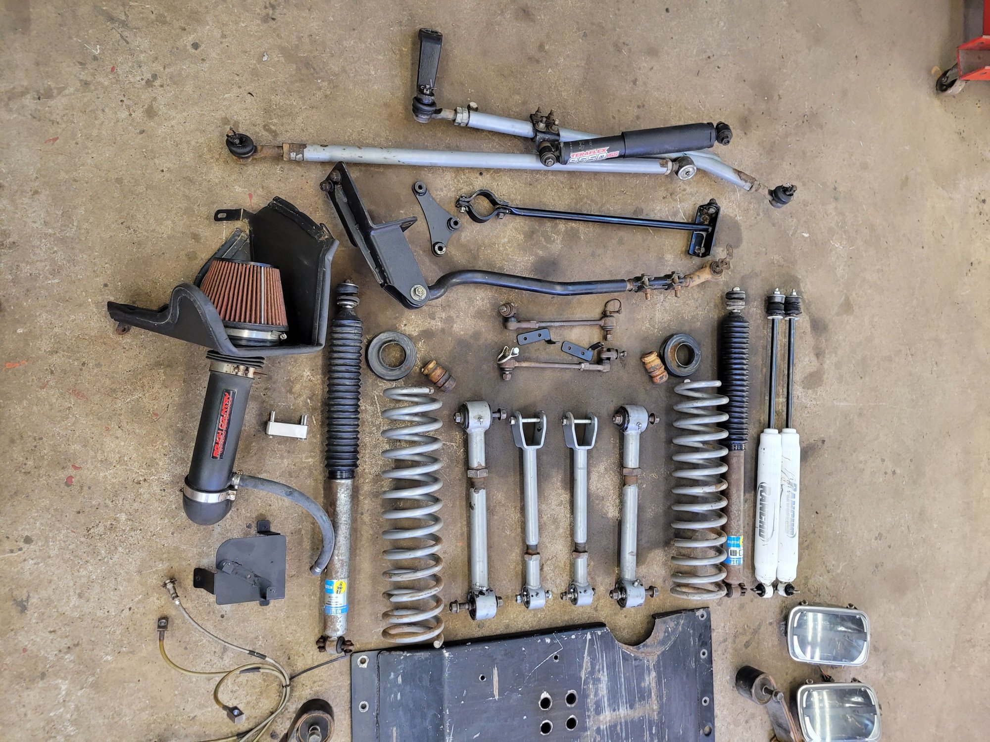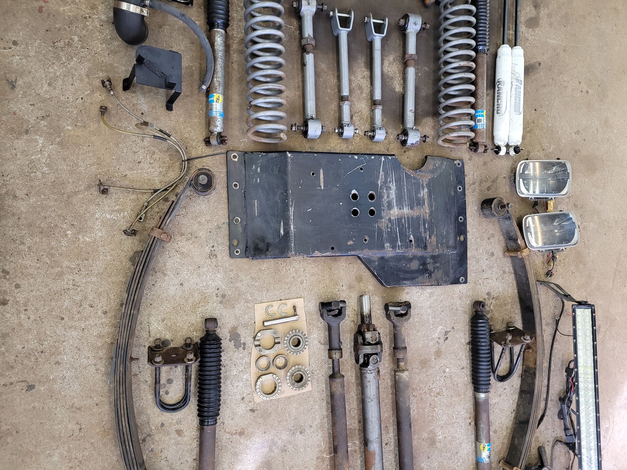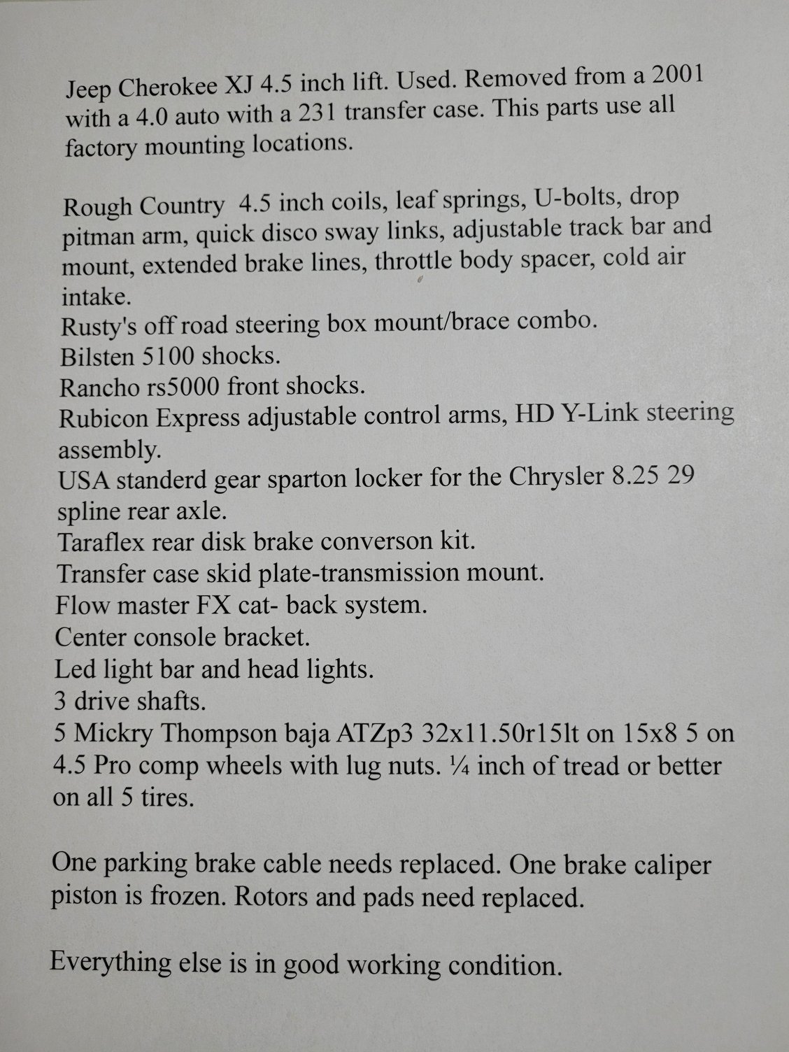 Off a 2001 with a 4.0 auto 231 T case. Please see the list in the pic for parts details. One parking brake cable, one caliper, rotors and pads are bad. Everything else is in good condition. Cash only. In person. No shipping. I'm in Bradford PA. $900.00
