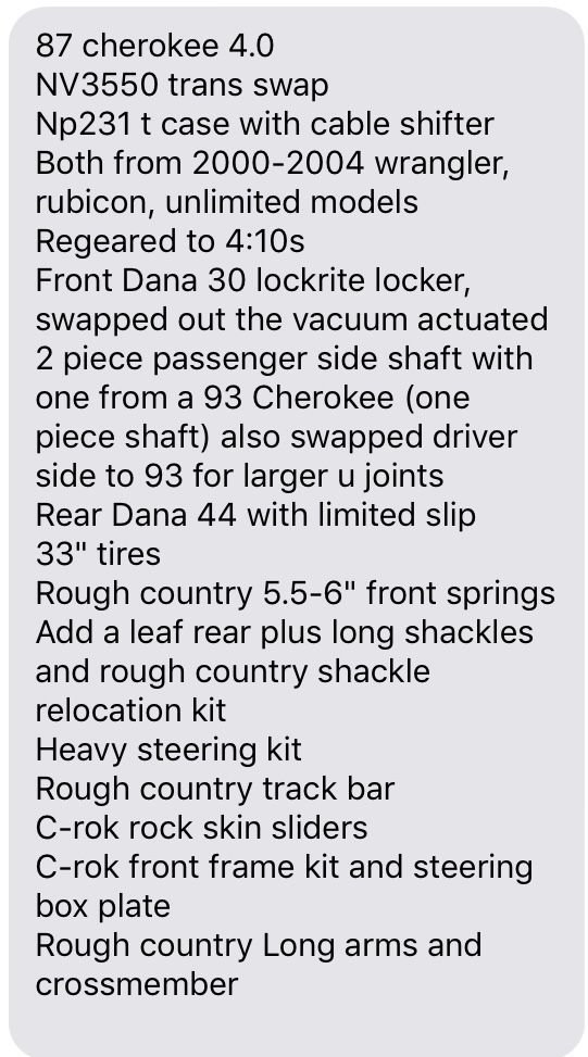 4.0, Factory Dana 44 rear, typical 30 front. Regeared to 4:10s, lockers in both. Kinda updated with newer Wrangler stuff(NV3350, cable shift 231, etc..) Bigger units, one piece front axle shaft. Current tires are 33/12.50
