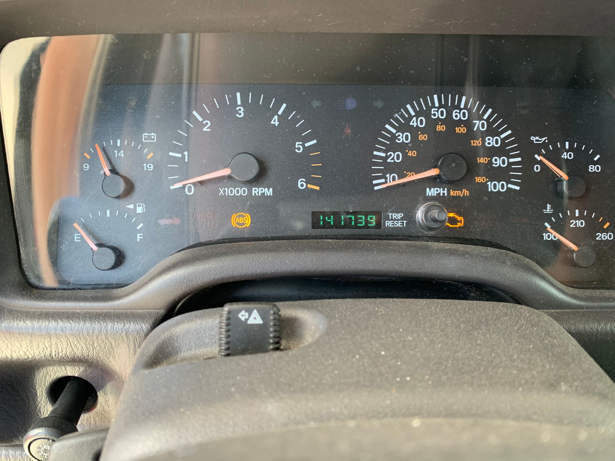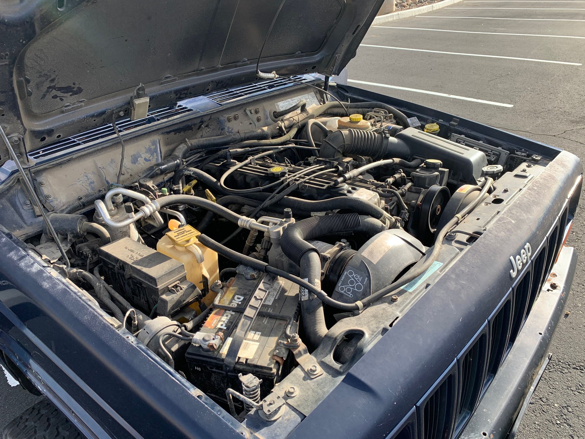 Jeep has 141739 miles, a clean title, heavy duty factory front and rear (gas tank) skid plates. Interior is in decent shape, not too dirty or worn out. Headliner is in good shape, not sagging or torn. For its age/mileage the XJ drives strong and straight but suspension components need service and replacement of some parts are needed. Typical leaks in engine bay around that valves, transmission pan. Nothing a little mechanical maintenance won’t take care of. Paint is original, faded and clear coat on roof, hood has oxidation. Passenger window/door switch occasionally works (drivers side no problem). Has some southwestern surface rust on a few places and components, easily removable. The front bumper has been replaced, the grill has some cracks, and the driver-side fender has a dent that can be easily fixed or replaced.