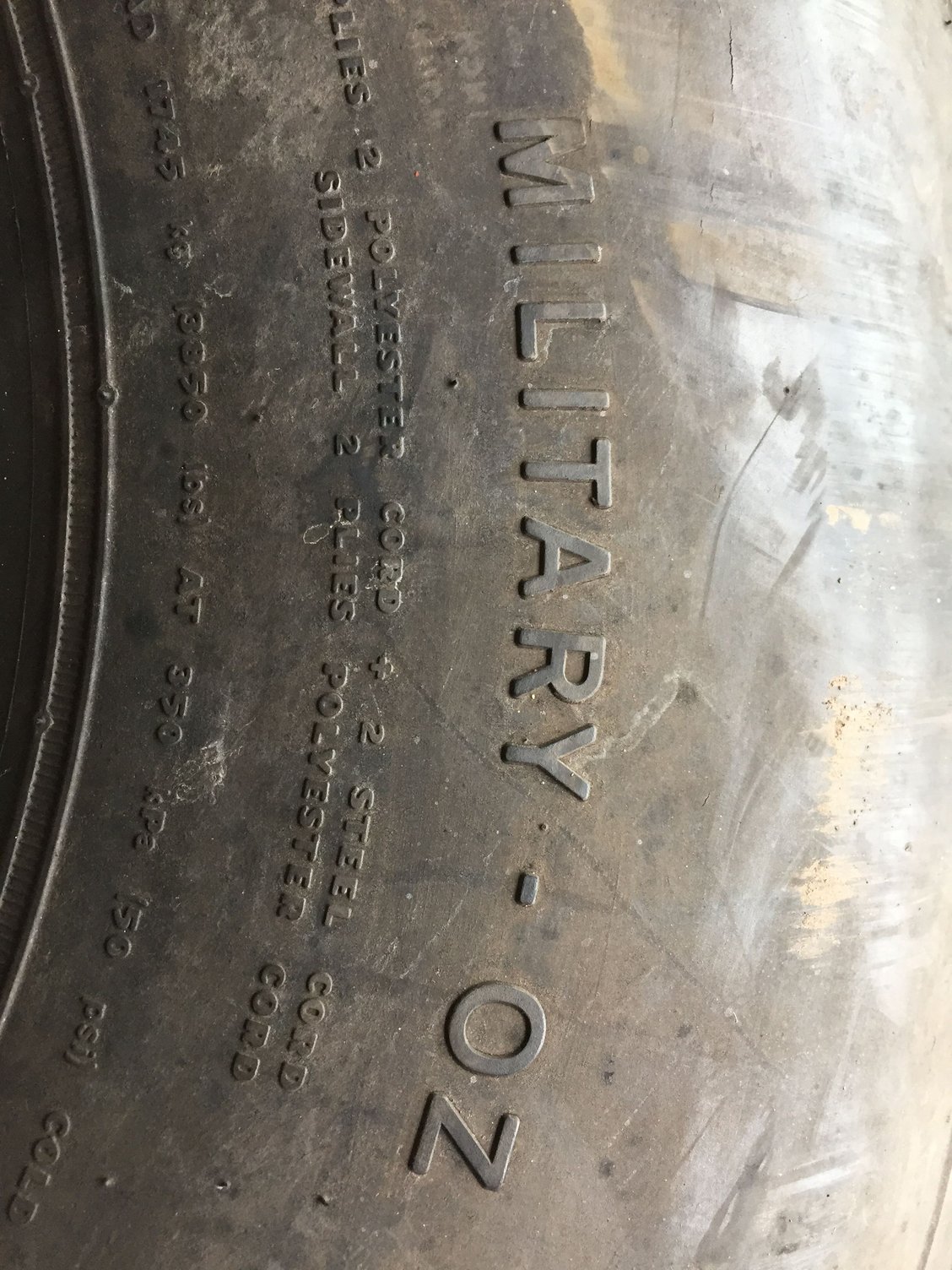 I've got 5 Military Goodyear OZ 37s on 8 lug wheels. 4 are mounted the fifth is just the tire. Tread is mint on 3, and a little under half on two. Thought about using them but changed my mind. Willing to negotiate, 600 OBO. located in Vernon, CT. 860-329-1736 call or text.