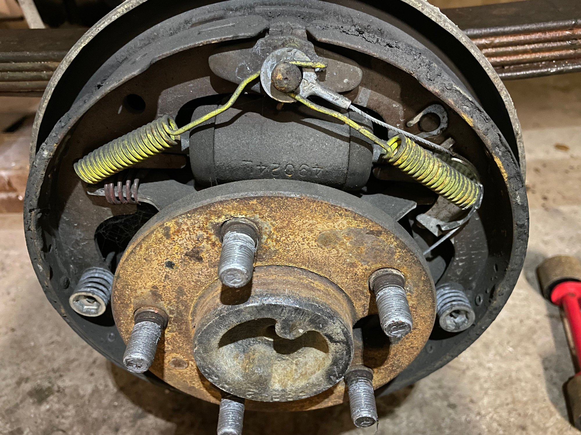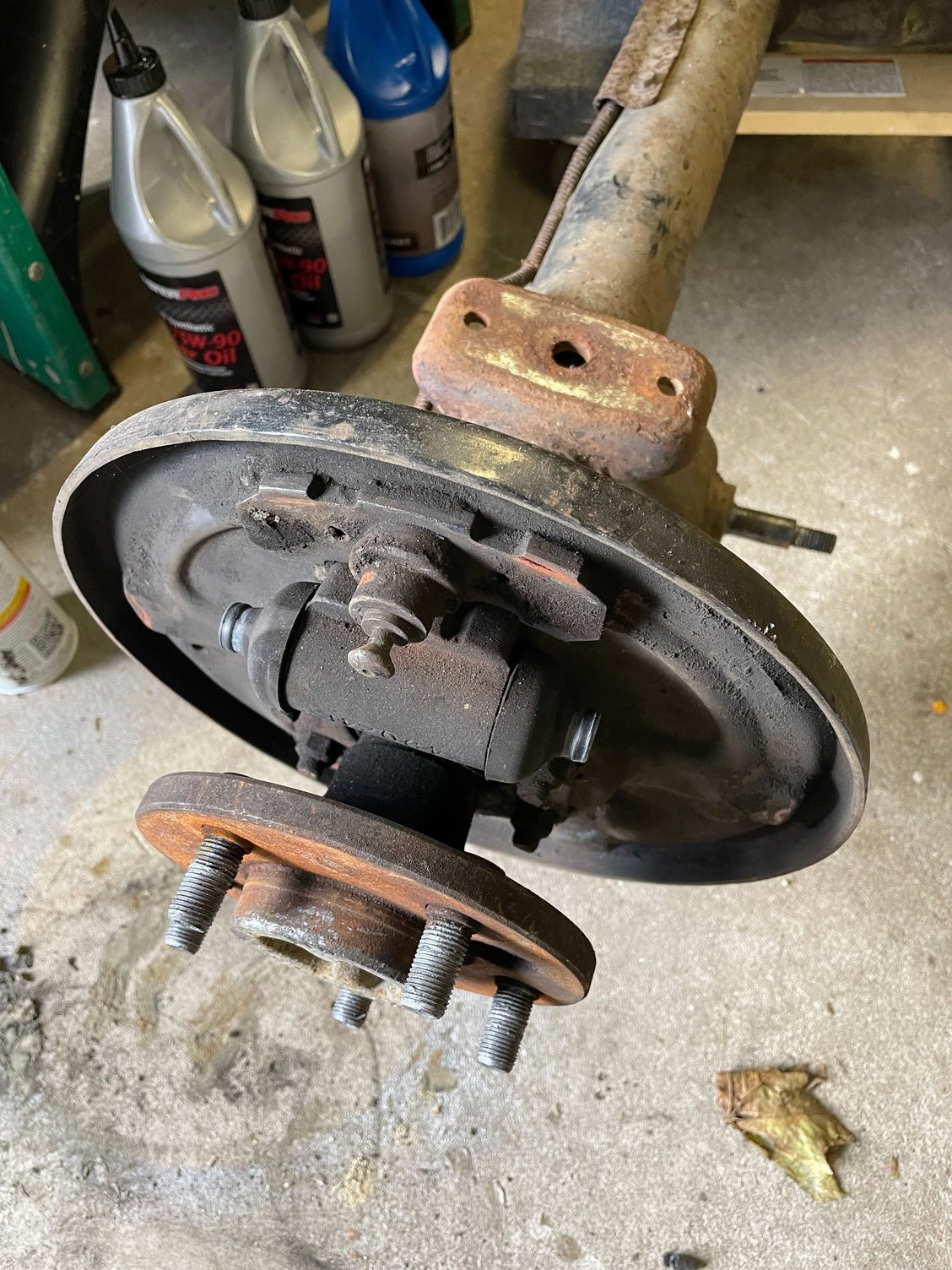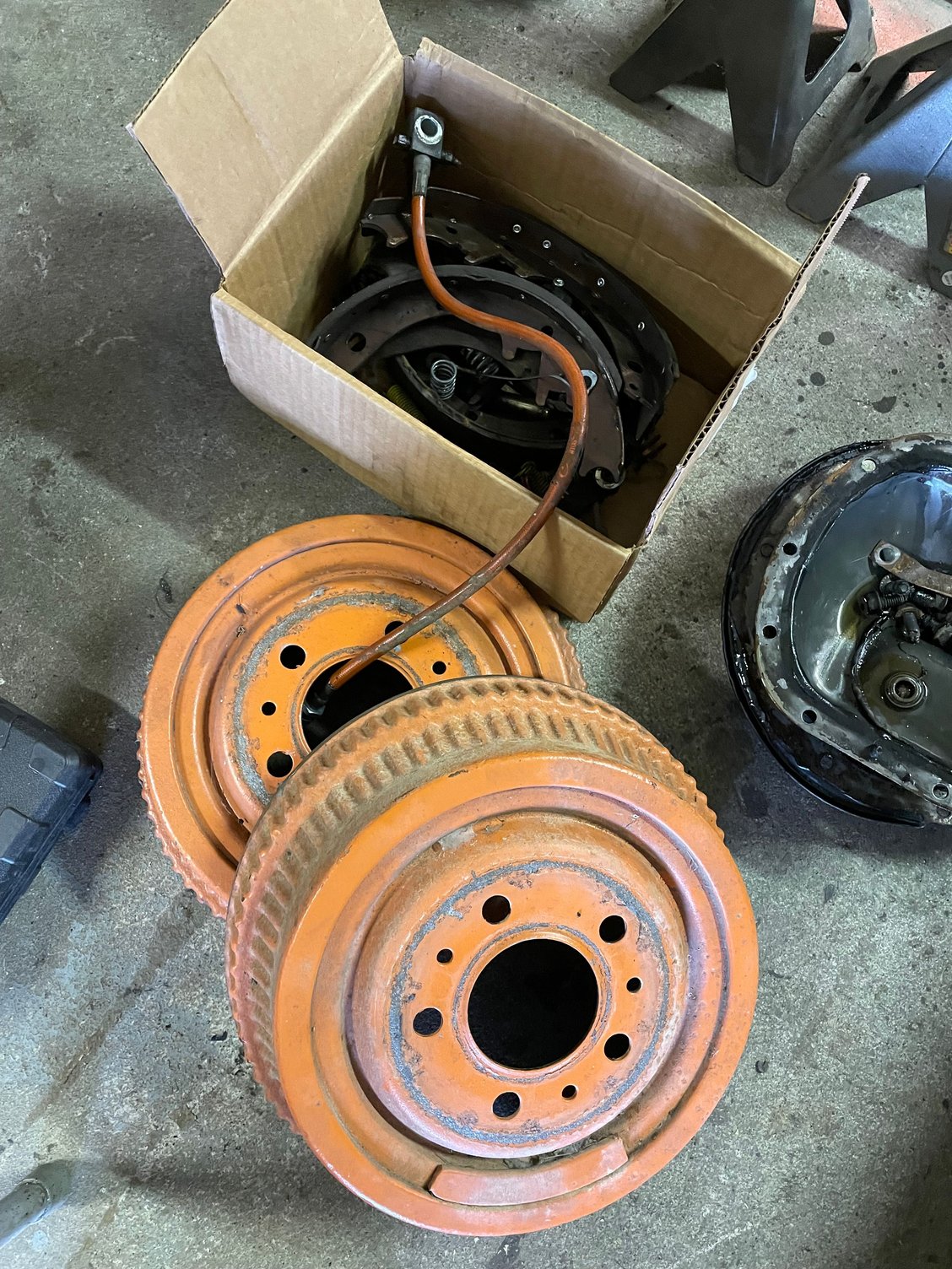 Complete Crown drum brake kit including cylinders. Less than 100 miles on these. I replaced the axle with an 8.25. Axle needs bearings. Backing plates are solid. California car never driven in New England winter.