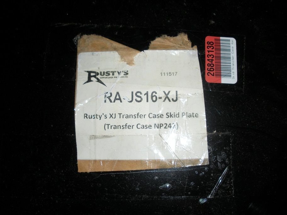 Rusty's XJ transfer case skid plate for the 242. Brand new. Never mounted but hardware is missing Does have the scratch that you see in the picture. Plus a mark here and there.
