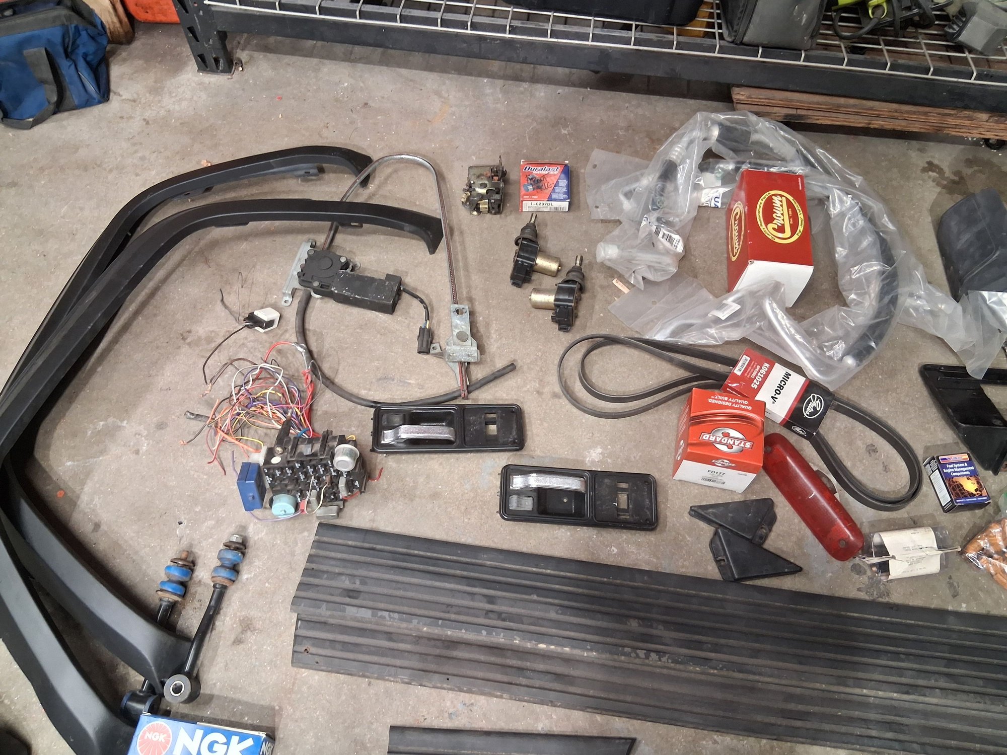 Jeep parts for sale. I have an OEM bumper mounted swing away tire carrier as well. It comes with the bumper reinforcement brackets. Please message if you want pictures. Also here is the lower door trim for older 2 door xj's. Pretty rare. Some really cool stainless brake light guards. These were an original dealer option as well I believe. Sensors, a fuse block, trim, etc. Feel free to message with questions.