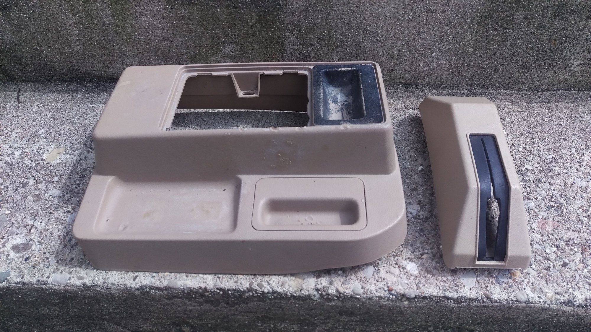 I have a tan colored mini console and e brake cover. Console is in rough shape but intact. A good clean and or paint and it will be fine. E brake cover is perfect.
