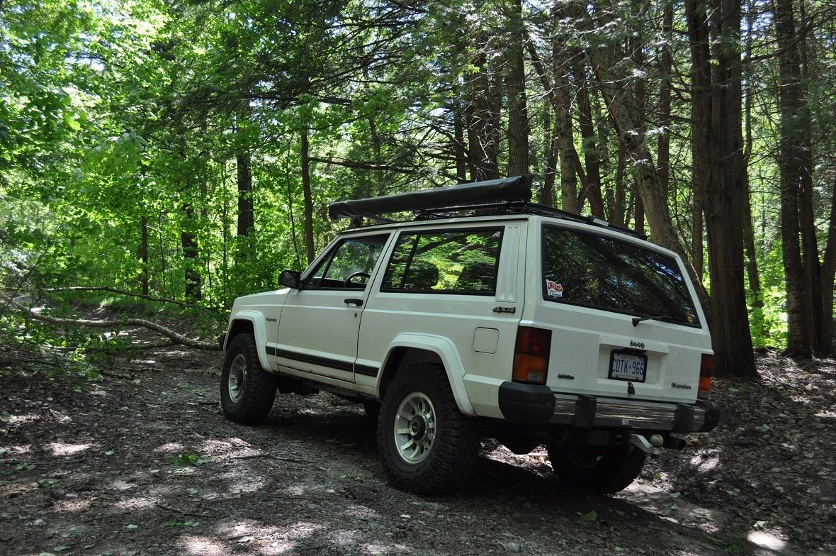 I usually establish a base camp and take my XJ, a 1989 Limited that looks more like a Laredo, off to hit some trails. I took the last pic just yesterday when I had to stop for a bit as the trail was blocked. Part of the blockage later became fire wood.