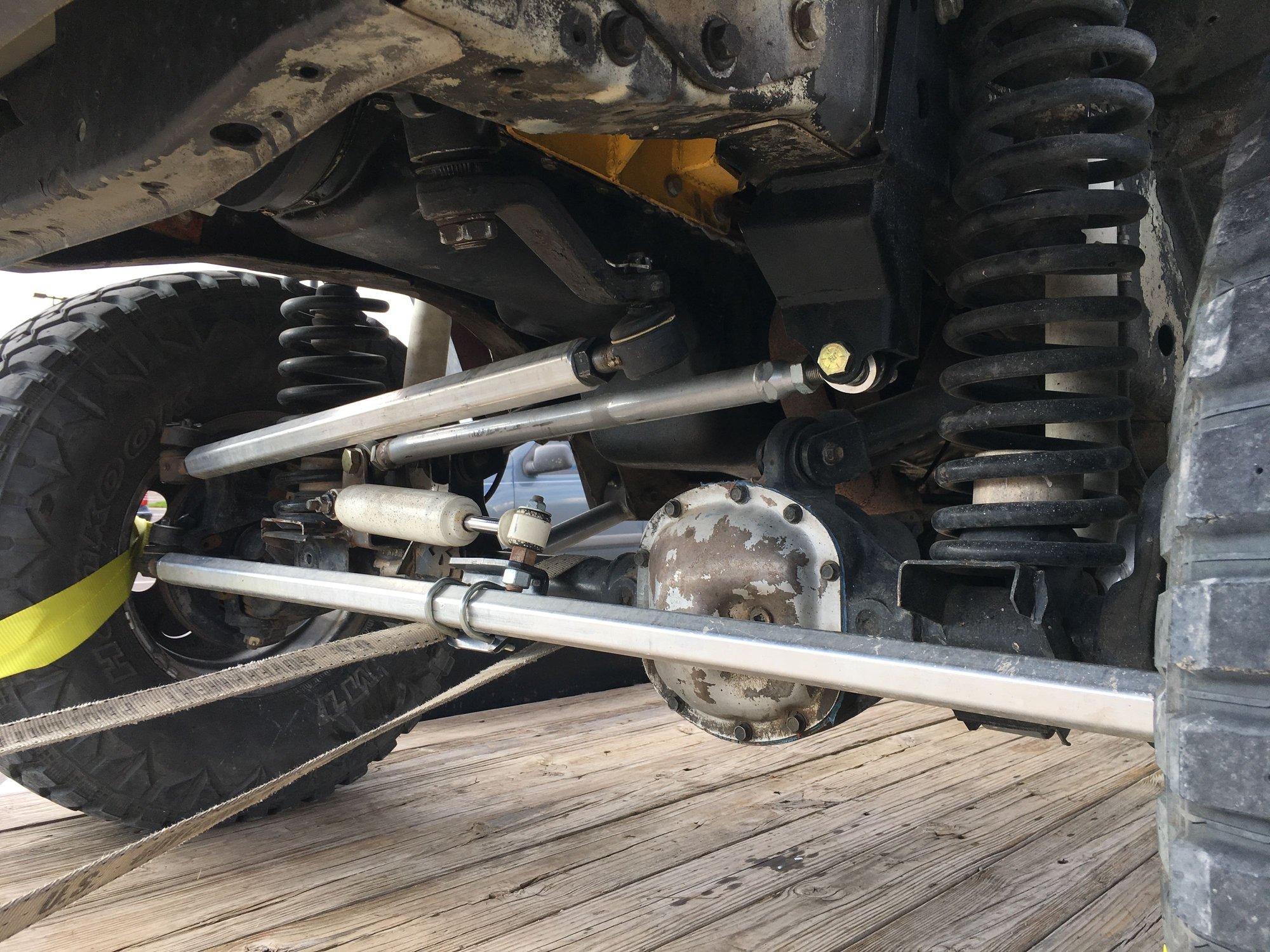 6.5" IRO lift coils in front, adjustable upper rough country arms and lower Rubicon express arms, Rubicon express double sheer track bar, spring over axle in the rear, BDS 6" shocks at all 4 corners.