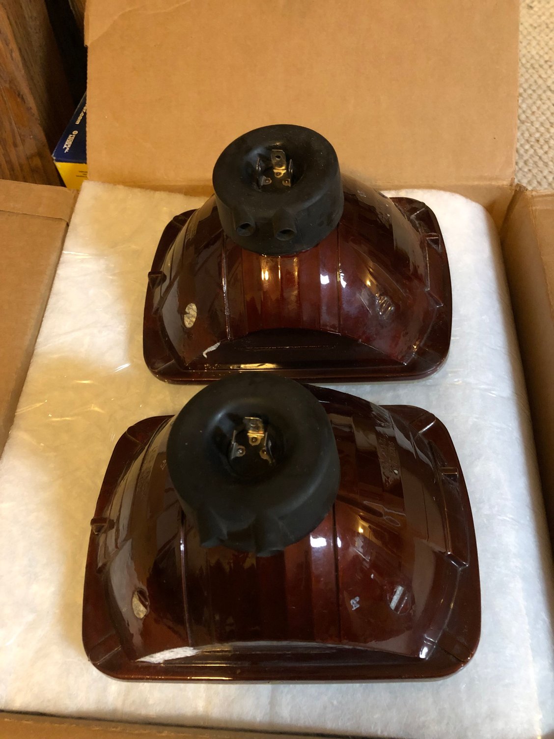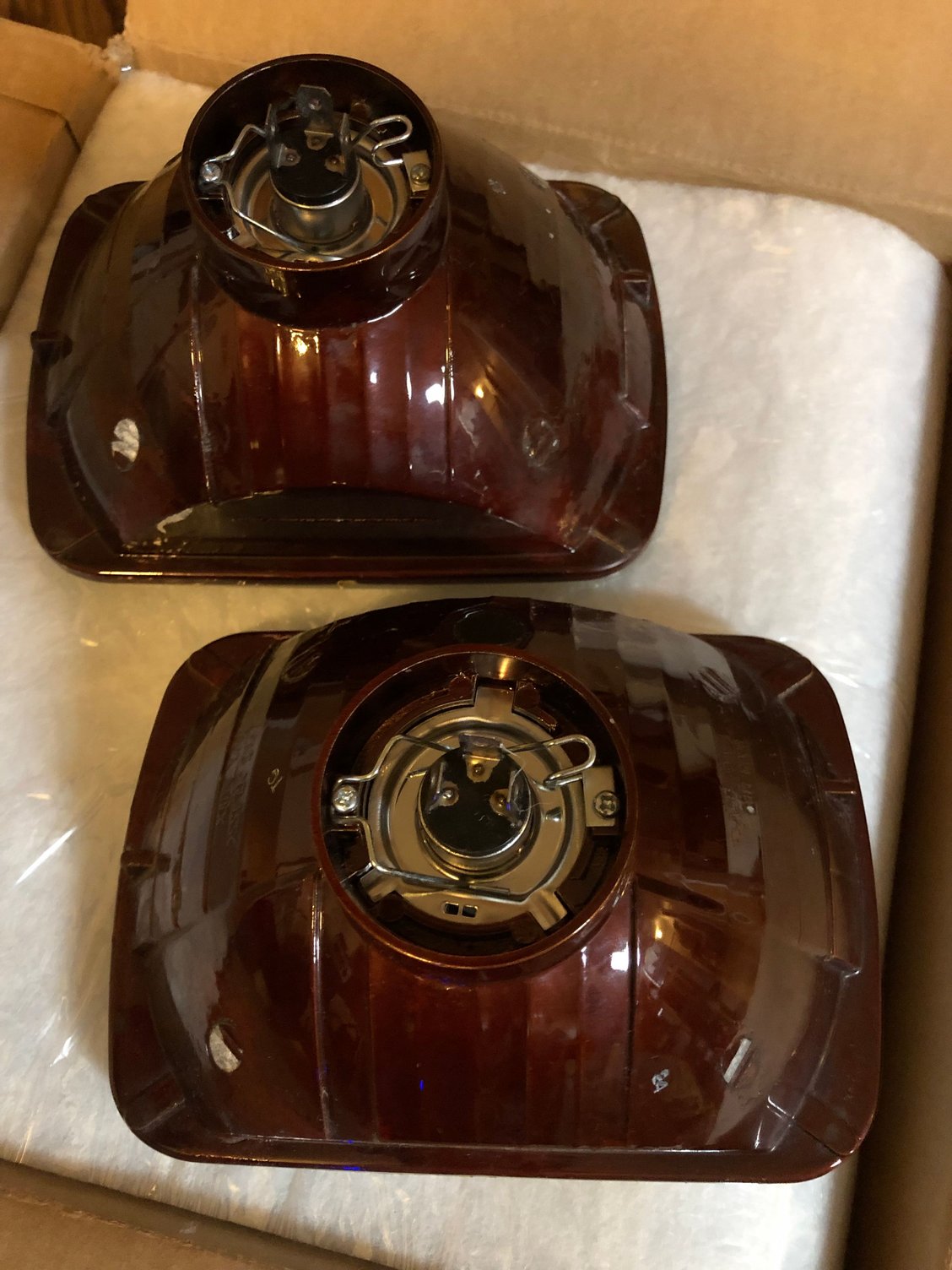 I just got this set of headlight housings off eBay for $50 shipped. Used, says they were pulled from a Chevy work truck. Shipped in the Chevy buckets with the retainer rings and screws, so I’ll have spares. Great condition, no defects in the glass or reflectors. Glass, marked DOT. With 9003 Silverstar Ultra bulbs (haven’t tested them) but I can put whatever I want in there anyway. Still got some dielectric grease on the terminals. I figured for glass DOT housings the price was good.