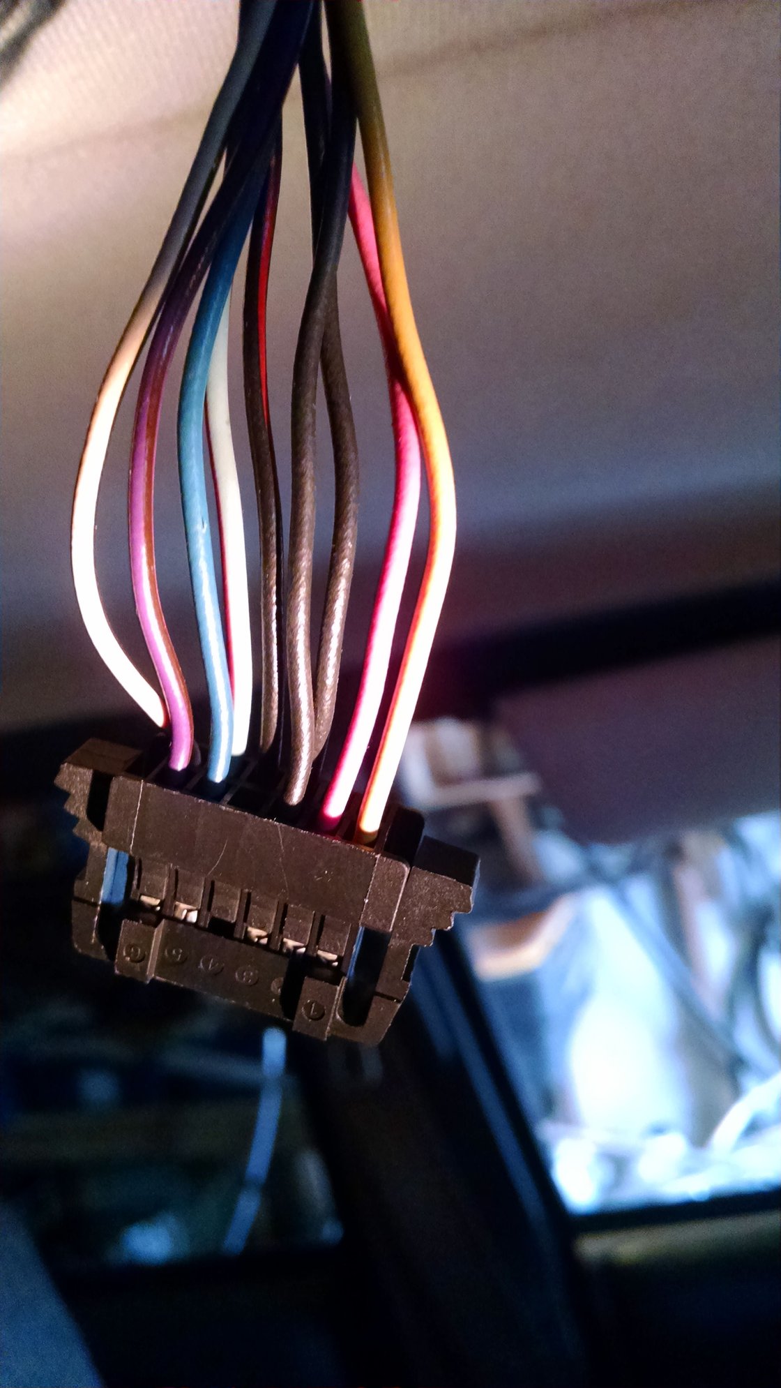 These 2 pics are what I am trying to figure out. On the overhead harness, from left to right, the colors are yellow/black,purple,dark blue,light blue/red stripe,black,black,pink,yellow. There is glare in the pic which makes the colors different that what they are. That is why i put the exact colors in this post above.