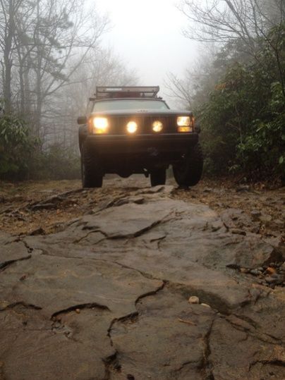 rocky path 1993 Jeep cherokee with Bushwacker cutout fenders, 3" lift, 1" spidertrax adapters, rubicon wheels, yakima roof rack, rotopax mounts, hela lights