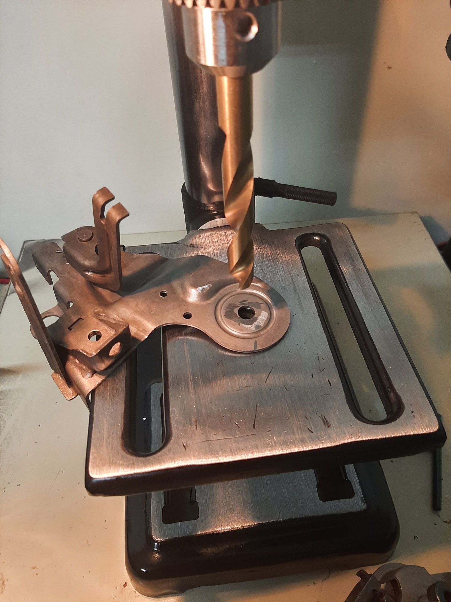 Time to drill the smaller out to 1/2 inch. This bracket sits ontop of the taper of the rivet.
