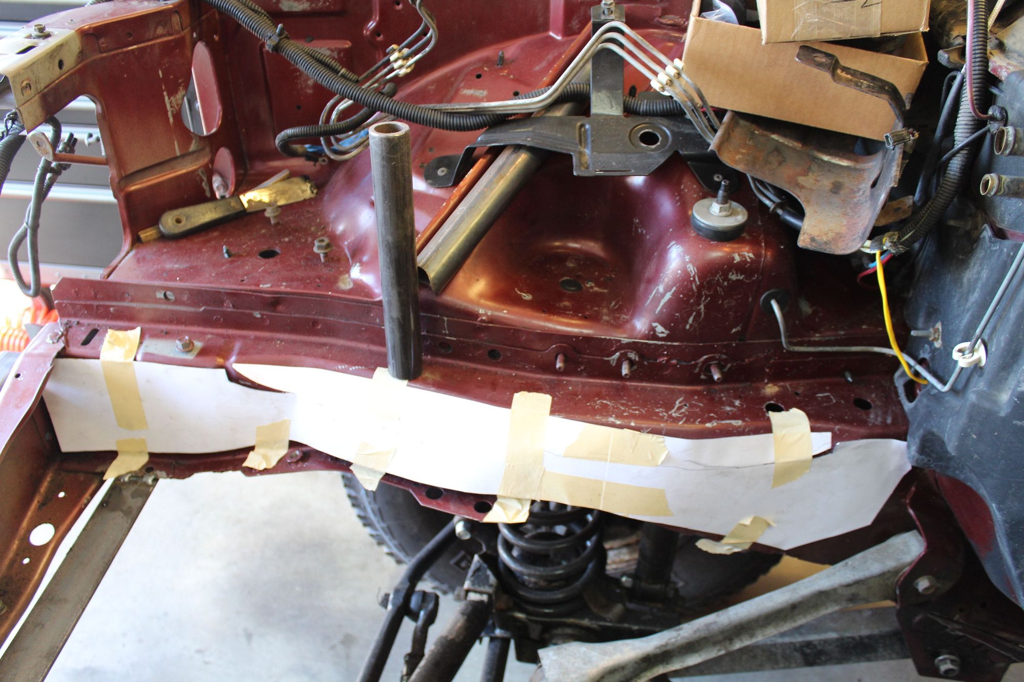 Thinking about tying in the roll cage into boxed frame by following the fender and spring support up at an angle, then turn it toward the firewall.